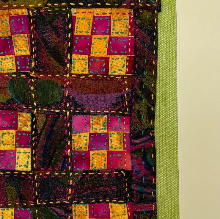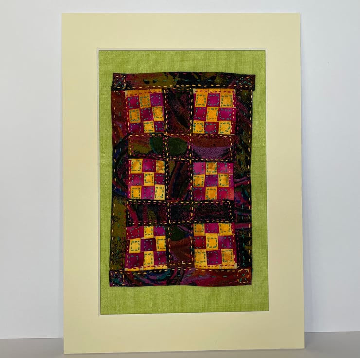 This piece is based on one of my full sized patchwork quilts and is constructed from a woven fabric design with embroidered “quilting’.