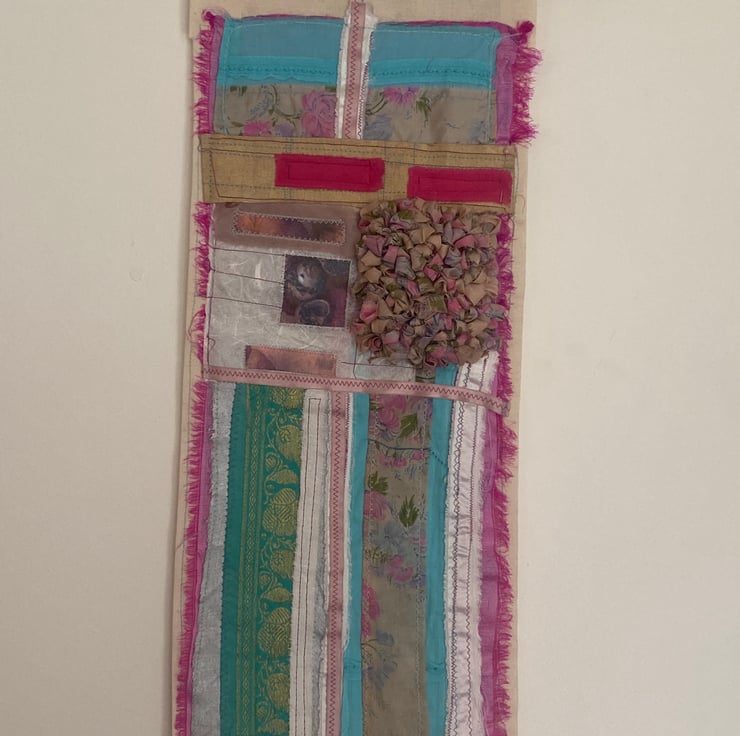 Hand Made wall Hanging using recycled materials and my own images sewn in. I have also incorporated rag rug pieces to give the Hanging a 3D effect. This piece is ready to hang on any wall you desire by a bamboo pole.