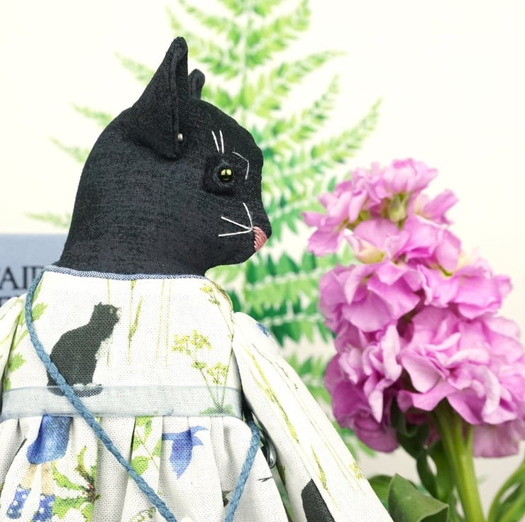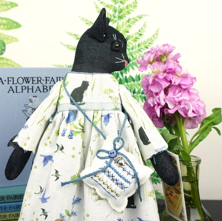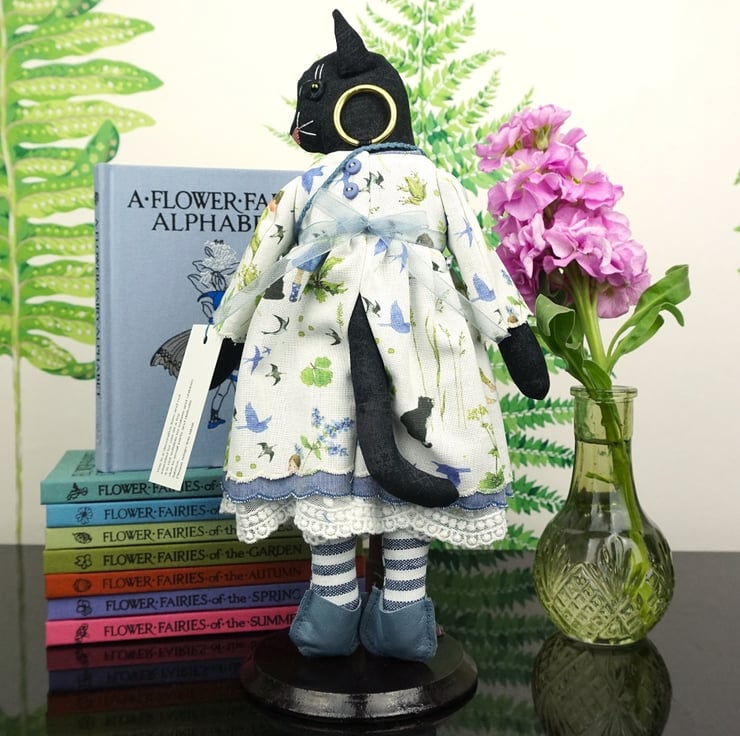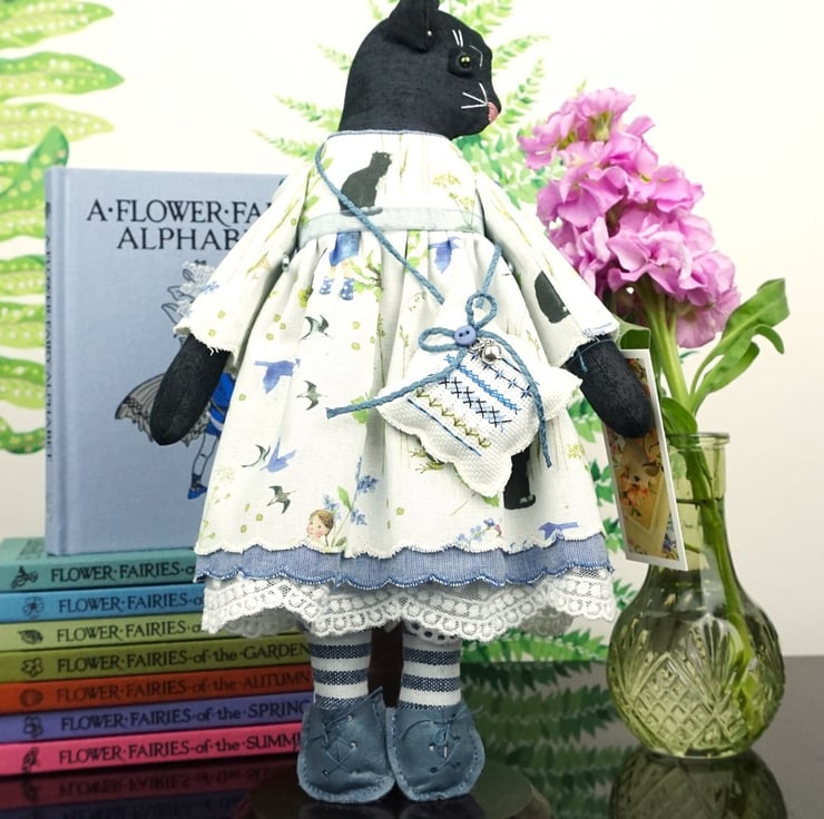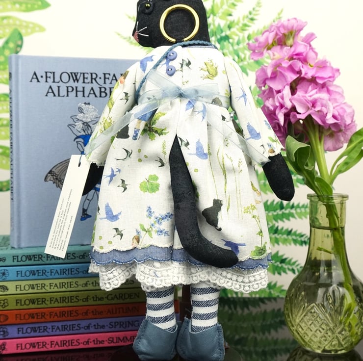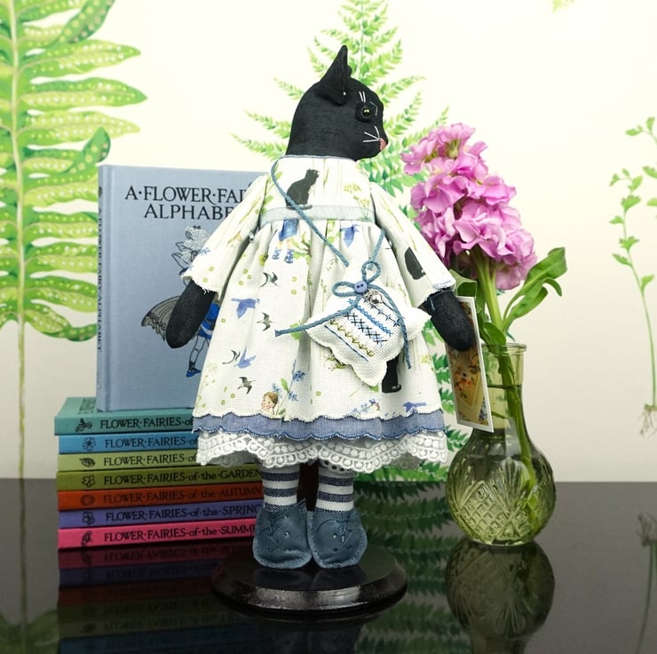 Katia is a little kitten doll with a brilliant green eye and a gentle disposition. She is dressed in an Acufactum print called Imelda and Katerle, with a little Imelda petting her cat. Laced with blue flowers this pretty print in perfect for summer. Detailed with tulle petticoats and chambray underskirts she also sports Broderie Anglais drawers.