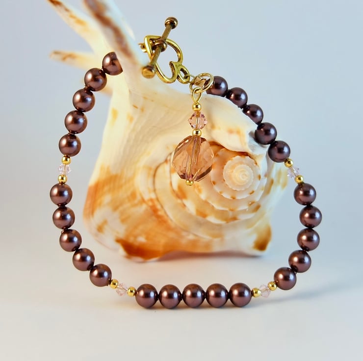 Pretty bracelet made from 5mm 'crystal Burgundy' Austrian crystal pearls, set with 3mm Austrian 'rosaline' bicones and tiny 2mm gold vermeil (sterling silver plated with 18k gold) spacers.