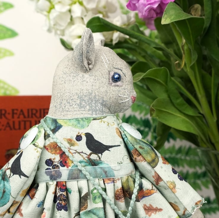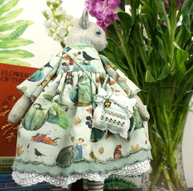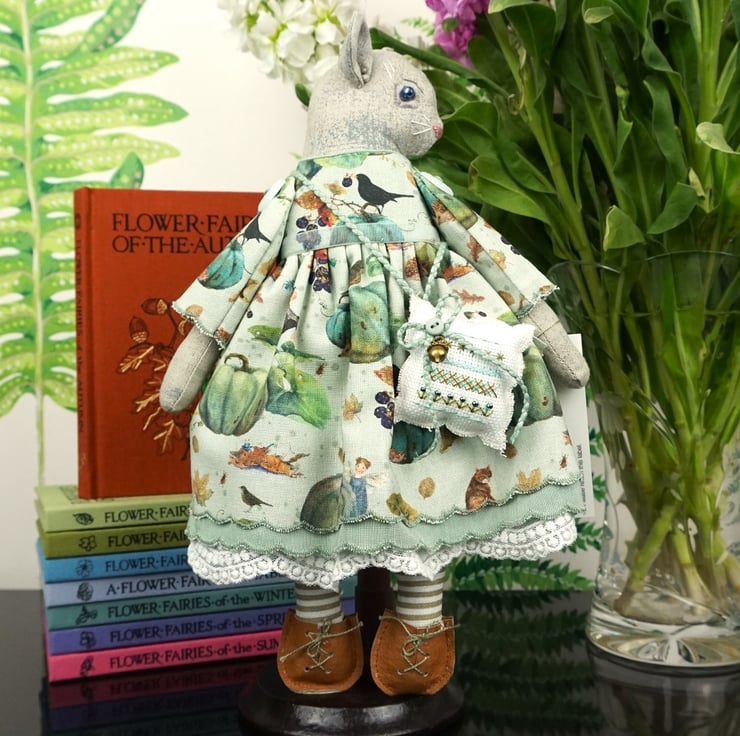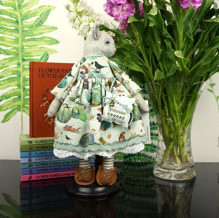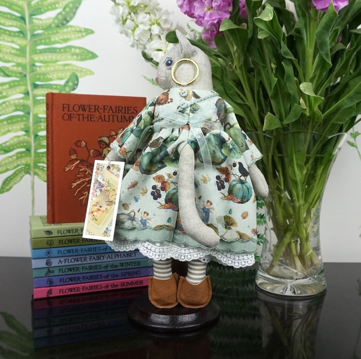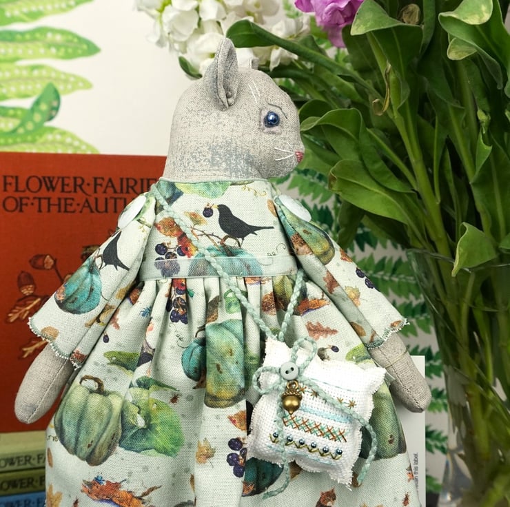 Katalia is a little kitten doll with a brilliant blue eye and a gentle disposition. She is dressed in an Acufactum print called Pumpkin Patch, with lots of little pumpkins and blackbirds dotted about. Rich jade green and brown colours. Detailed with tulle petticoats and chambray underskirts she also sports Broderie Anglais drawers.