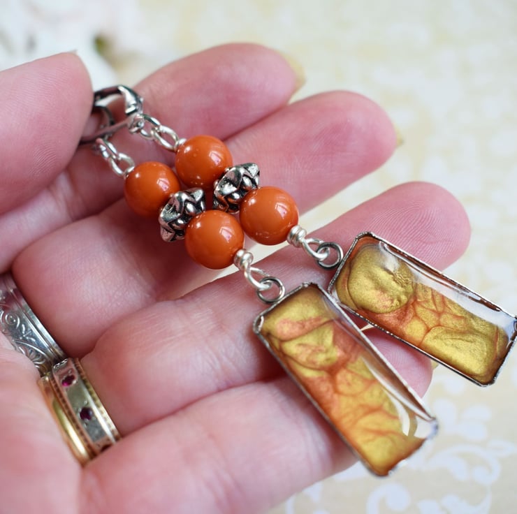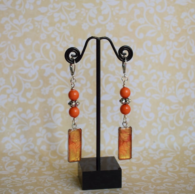 There's a wonderfully earthy and organic feel to these earrings, The stainless steel rectangular pendants have been painted in a mix of orange, gold and a terracotta colour and then given a covering of clear resin to seal and protect them. They hang below deep burnt orange Czech glass beads and a Tibetan silver spacer bead. The earwires are hypoallergenic stainless steel leverbacks. I love these for dangly earrings as they give a really secure hold and there's no tricky backs to lose either! If you have unpierced ears and would like clip ons just choose that option from the drop down menu. You can also choose silverplated earwires if you would prefer them, also in the drop down menu.