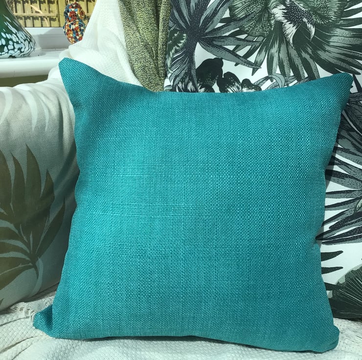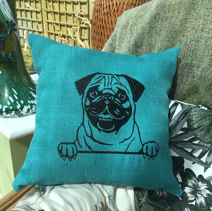 This cute Pug is embroidered in black onto a Teal linen look upholstery fabric.