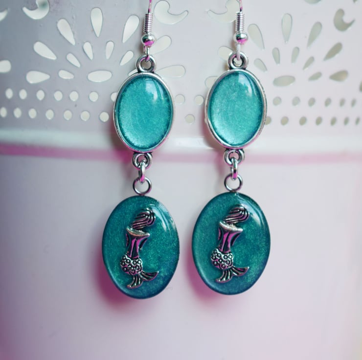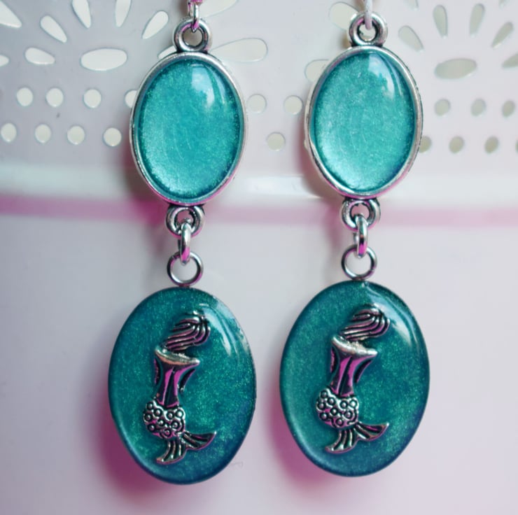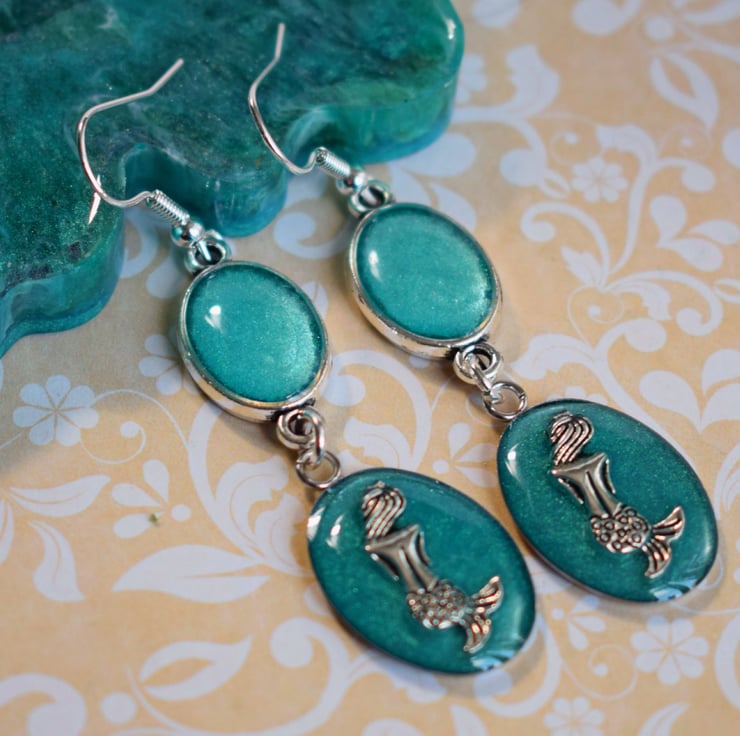 These pretty mermaids sit with their back to us probably gazing upon the turquoise blue waters. The earrings are then finished with an oval connector filled with the same turquoise resin and hung from silverplated earwires. You can choose to swap these for clip ons if you have unpierced ears or you could swap to hypoallergenic stainless steel, your options are in the drop down menu.