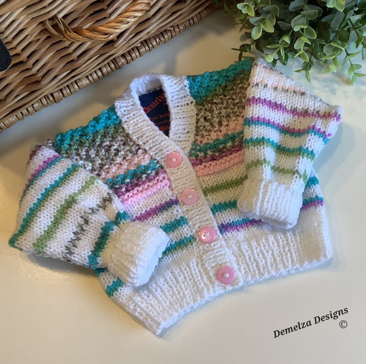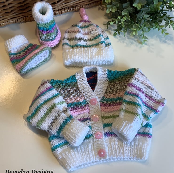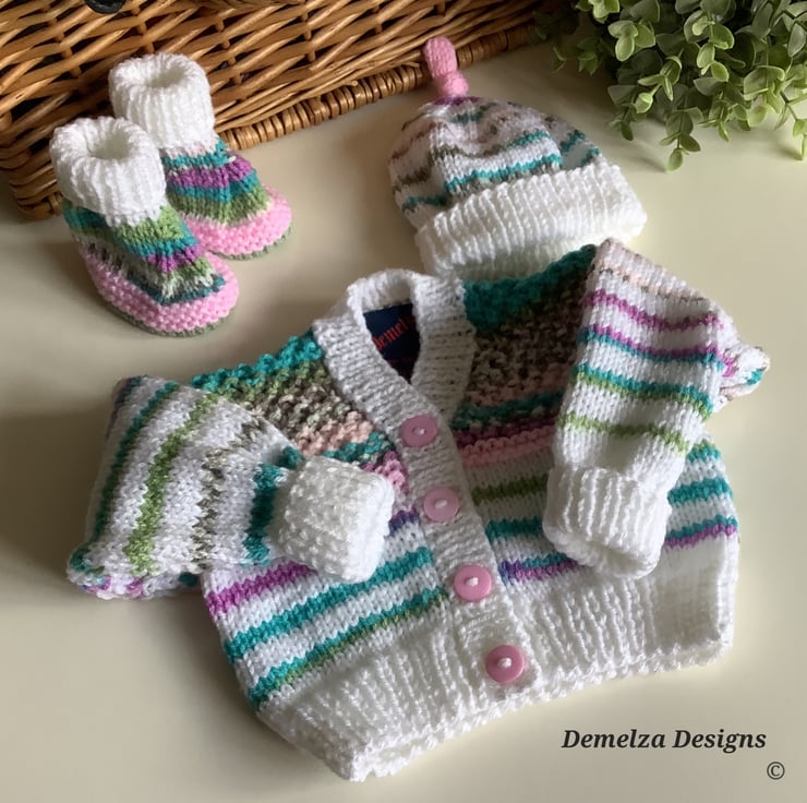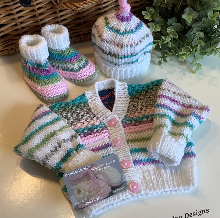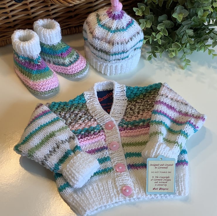This beautiful brightly coloured baby set has been designed and lovingly hand knitted in Cornwall using branded quality machine washable premium acrylic yarns.