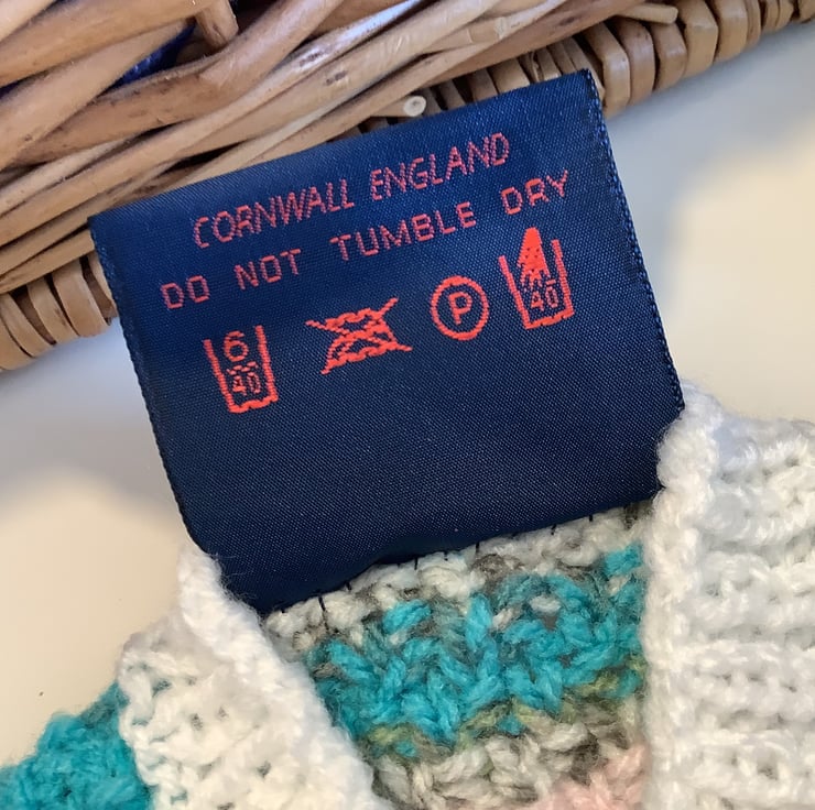 Baby knitwear is designed and hand crafted by Demelza Designs in Cornwall meeting UK baby safety standards, Only branded premuim acylic, acrylic/natural fibre blends or pure natural fibre yarns are used in baby knitwear which conforms to BS984/76 standards.