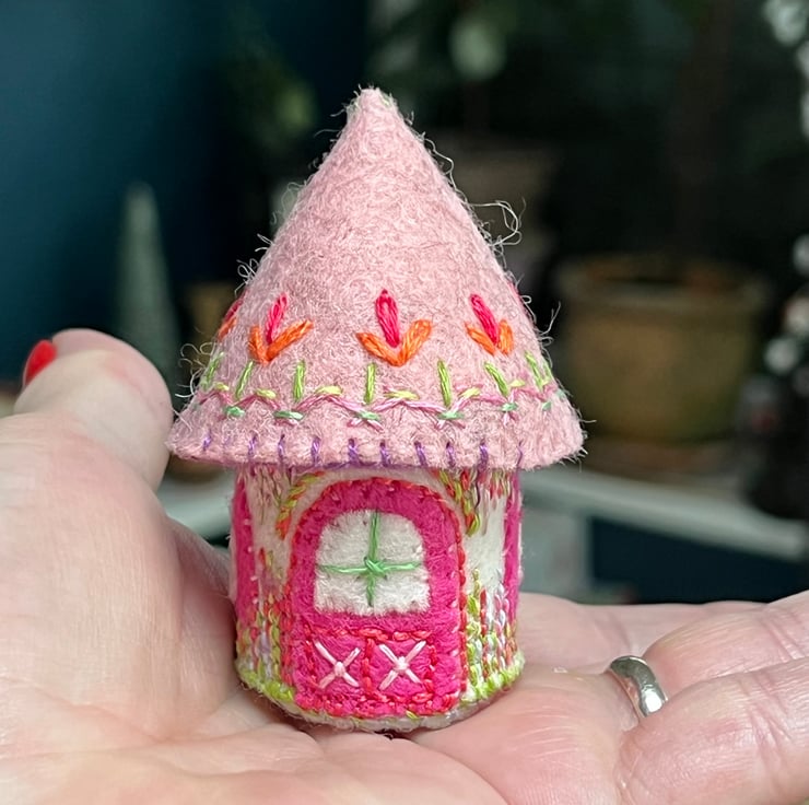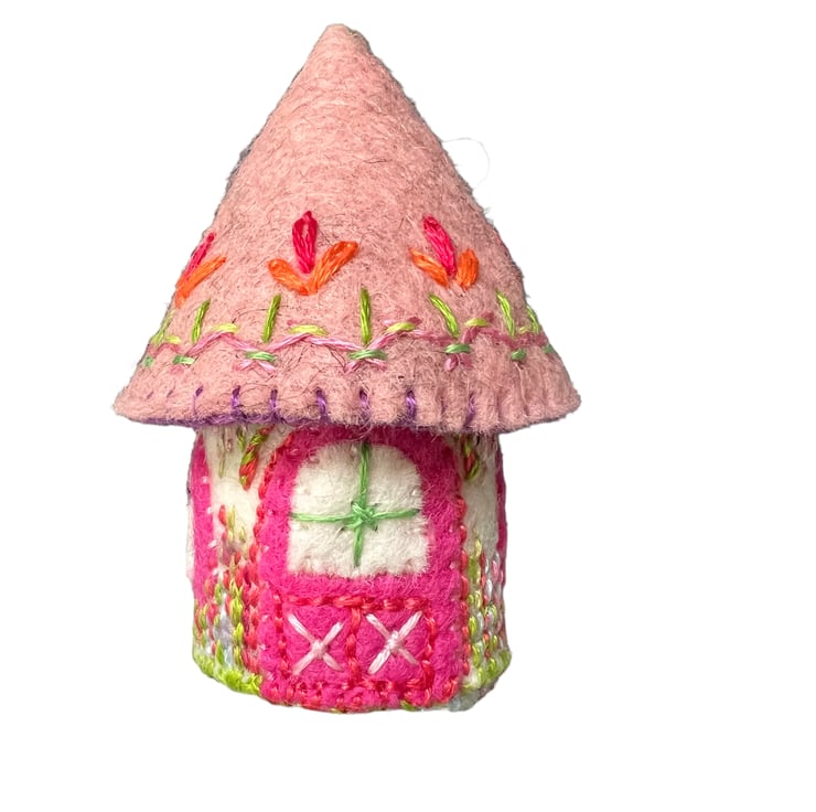 This Fairy cottage is covered in bright jewel coloured hand embroidery. The fully lined roof comes off to reveal a tiny pot in which to place a tooth for the Tooth Fairy to magically convert into money by the following morning.