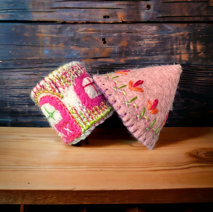 All of my makes are eco friendly and made to last from 100% wool felt and stuffed with washed wool fleece sourced from Yorkshire. I use DMC cotton thread to embroider folk patterns and stitches creating totally unique heirloom treasures.