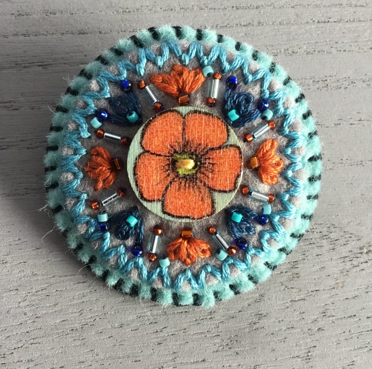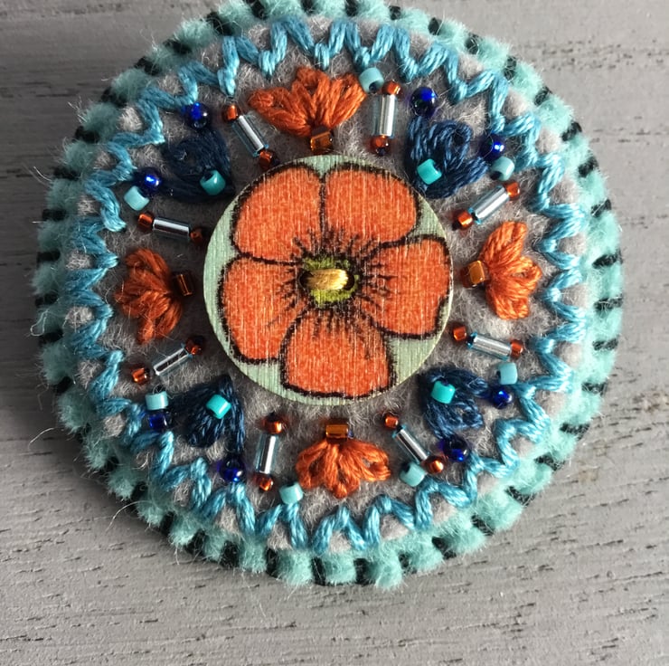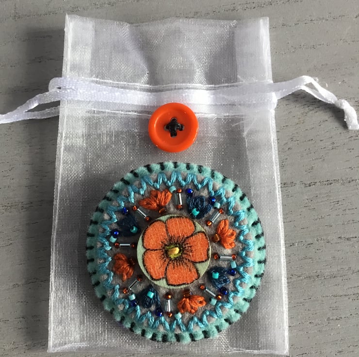 This Hand Embroidered Orange Blossom Brooch has a wooden button with an Orange Blossom Flower on it. This button is stitched onto circles of grey and pale blue felt. Hand embroidered Lazy Daisy Stitches in dark blue and orange embroidery thread, blue and orange bugle and seed beads, radiant from this Flower button.