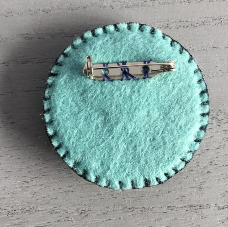 This brooch is 5 cms or 2 inches in diameter. …… a nice wearable size. It has a metal brooch pin with a safety catch sewn onto the back. This brooch will brighten any cardigan, coat, jacket, blouse, or jumper.