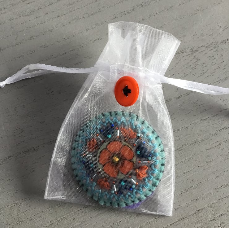 This hand embroidered brooch is gift wrapped in an organza bag, decorated with an orange button. A protective bag to keep the brooch in when not worn. This hand embroidered button brooch makes a lovely birthday, thank you, friendship or Christmas gift…..or a gift for yourself. It’s light to post so makes a nice letterbox gift.