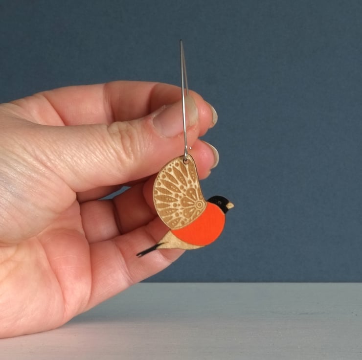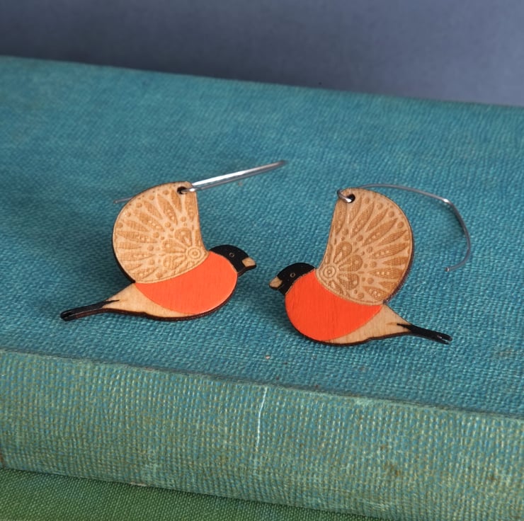 These jolly bullfinches are miniature versions of our wall hangings. They have been cut from 2mm birch ply and etched and hand painted on one side with black heads and tails and vibrant orange bellies. Their wings have a delicate folk art pattern etched into them.