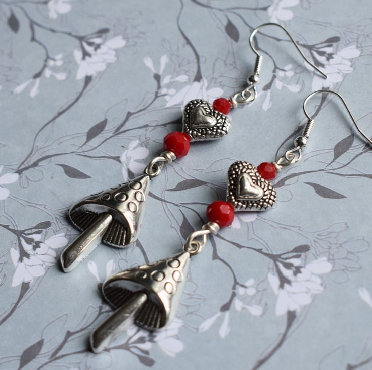 Made with some lovely Tibetan silver toadstools below opaque red faceted glass beads and little silver hearts these are perfect for lovers of the cottage core and nature inspired styles.
