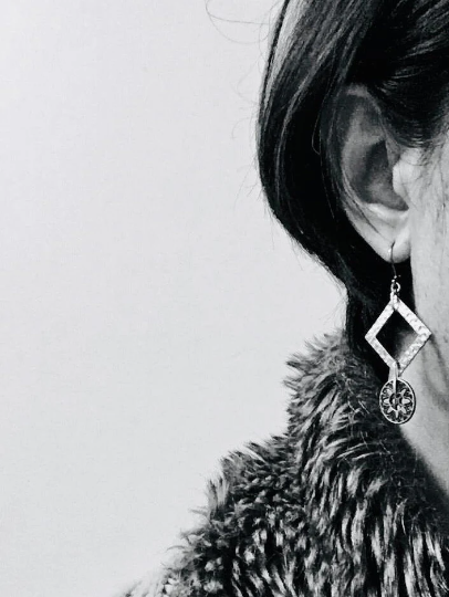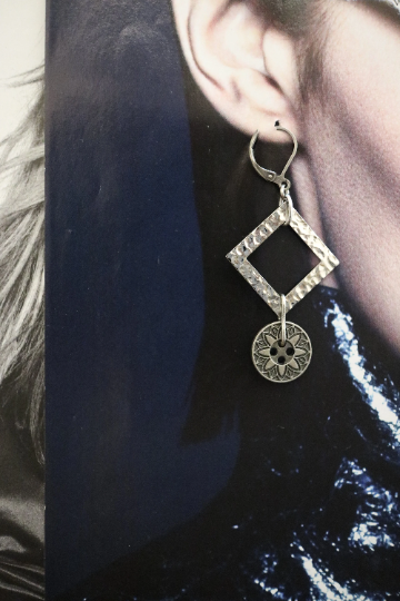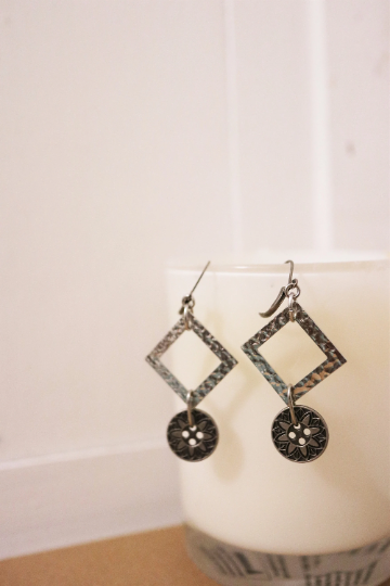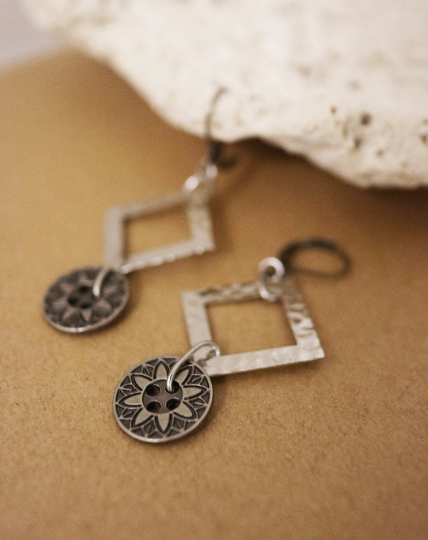 Up-cycled square shaped stainless steel - vintage button dangle earrings