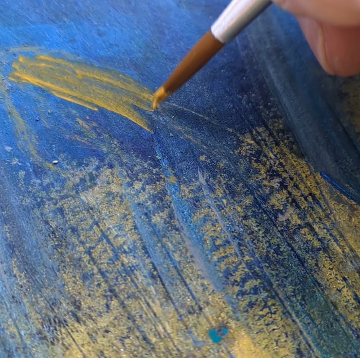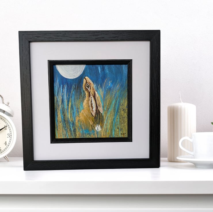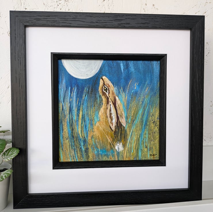 This beautiful framed original painting features a mesmerising moon gazing hare, capturing the peaceful and mystical atmosphere of a moonlit night. Created with acrylic paint on paper, this unique piece is sure to make a statement in any room. The little hare has been hand painted on to the deep prussian blue background with mono printed golden grasses adding depth and texture to the artwork. Perfect for placing on a shelf, sideboard or wall space in the home would also make a thoughtful gift for a loved one. This stunning painting will bring a touch of enchantment to any setting. Whether you're a nature lover or a fan of unique artwork, this Moon Gazing Hare painting is a must-have for any art enthusiast. This is a one-off piece and its mono print background means it is truly unique so if you love it pop it in the basket quickly.