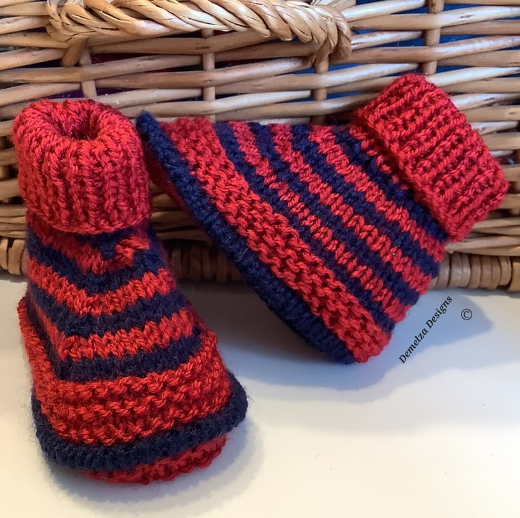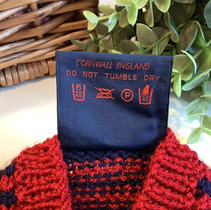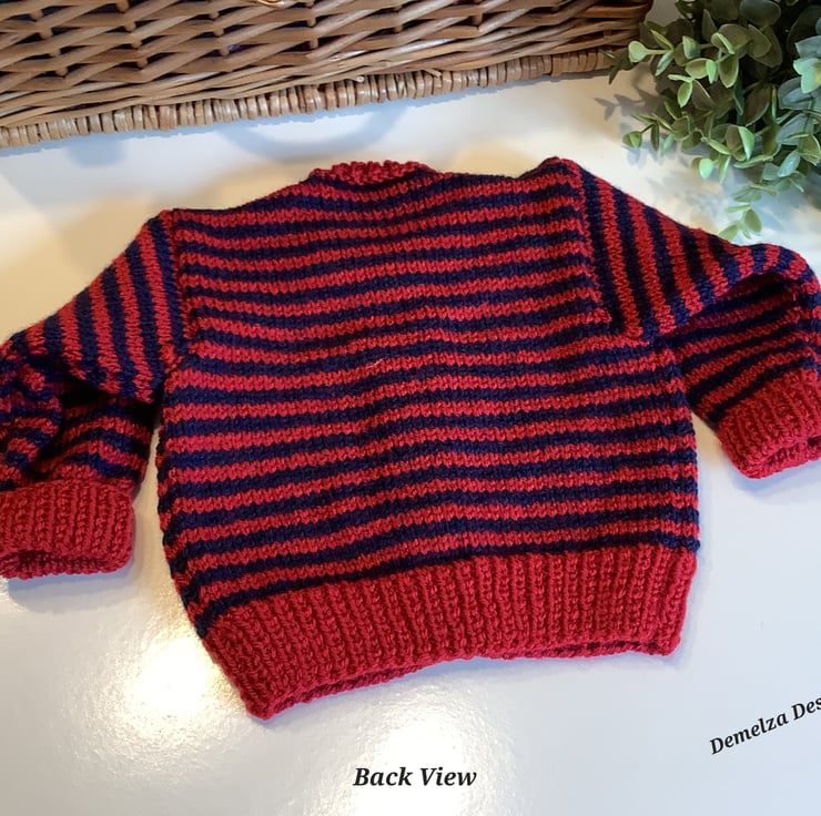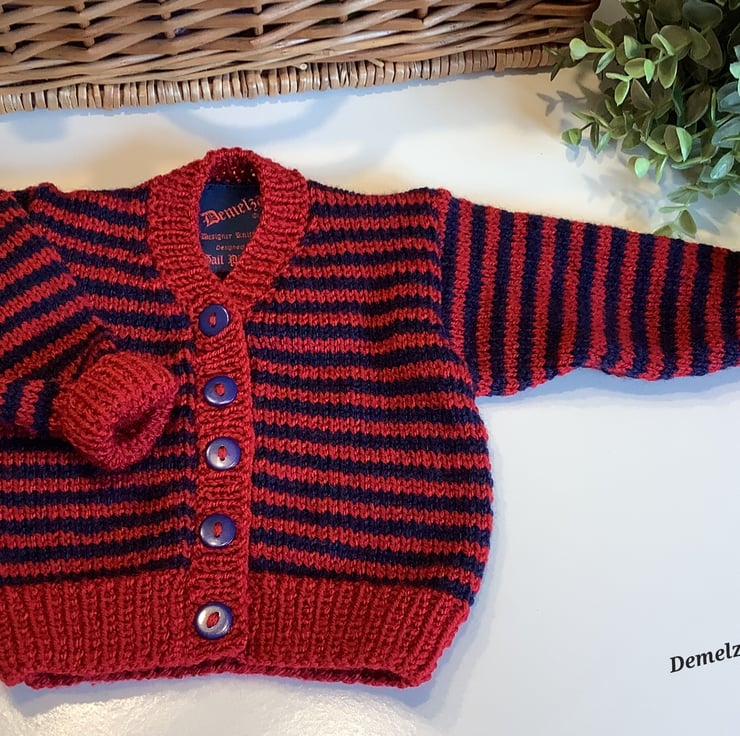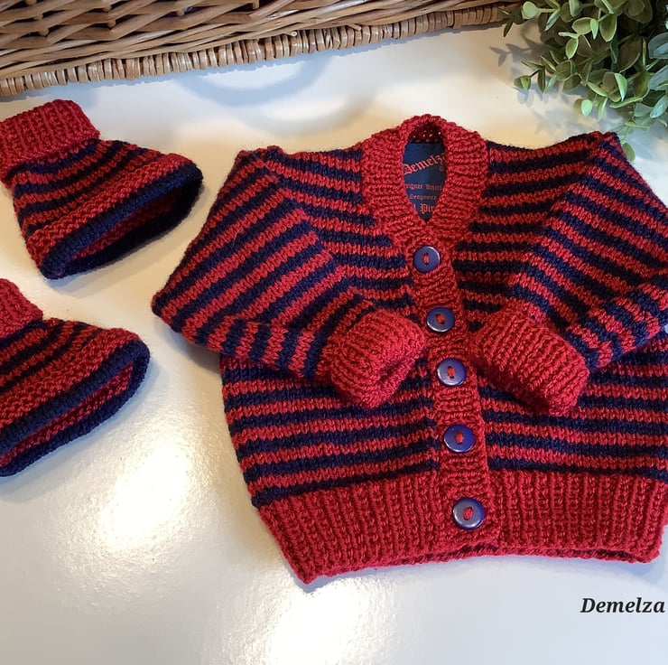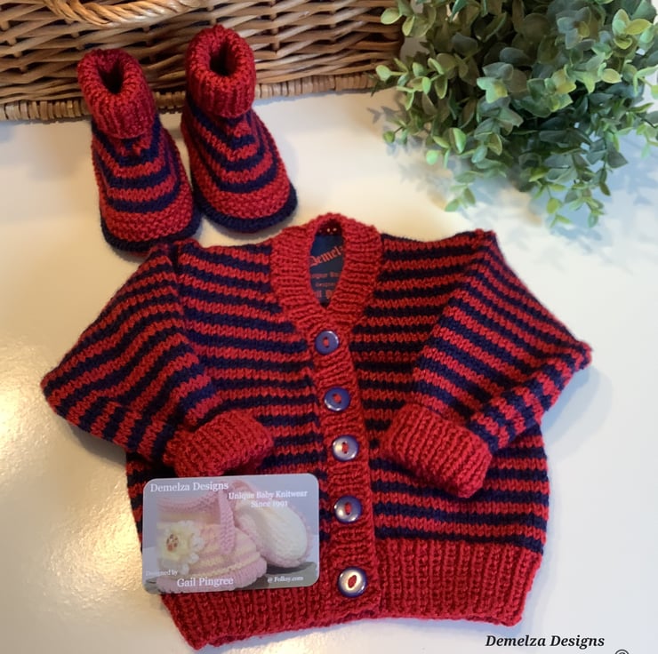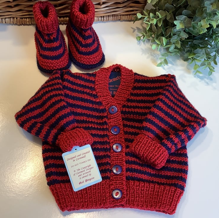 This bright red and navy blue cardiganand booties set has been designed and lovingly hand knitted in Cornwall using branded quality machine washable premium acrylic yarns. The Demelza Designs garment label is attached to the back neck edge with the care instructions woven within it on the reverse side. A Demelza garment swing tag will be attached to the cardigan front for a professional touch one expects from designer products.