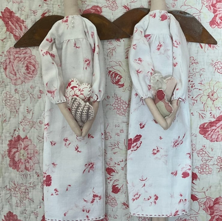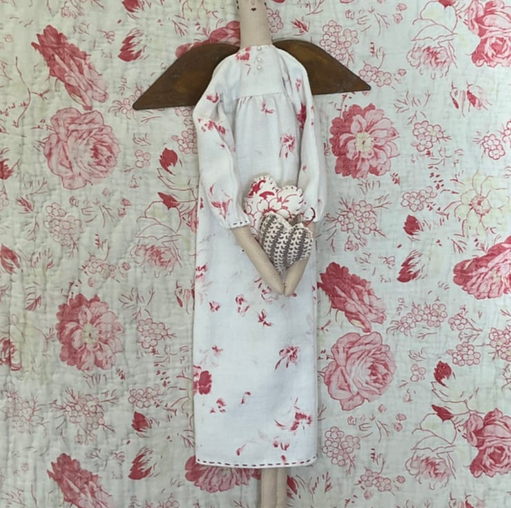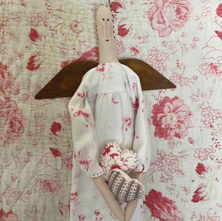 She has a long dress made from a really pretty printed, vintage French cotton. The bodice is trimmed with 3 pearl beads She is finished off with rusty tin wings and she is holding a pair of hearts made from more vintage fabrics. The hearts are loose and need to be slotted into her arms, once hanging in position.
