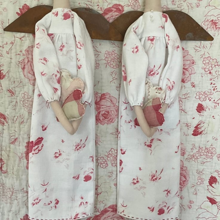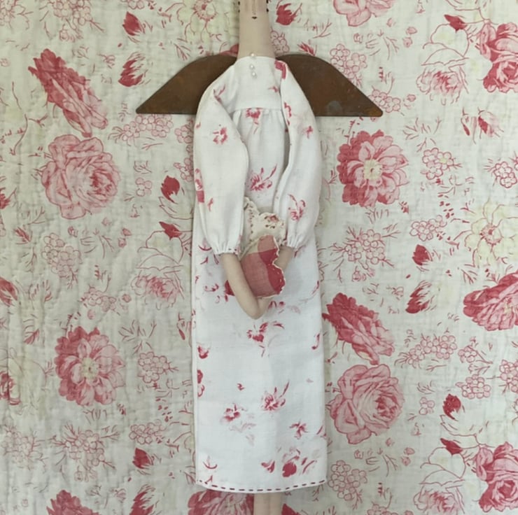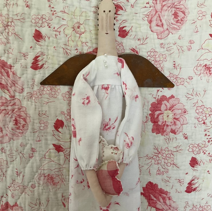 She has a long dress made from a really pretty printed, vintage French cotton. The bodice is trimmed with 3 pearl beads She is finished off with rusty tin wings and she is holding a pair of hearts made from more vintage fabrics. The hearts are loose and need to be slotted into her arms, once hanging in position.