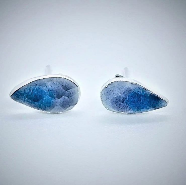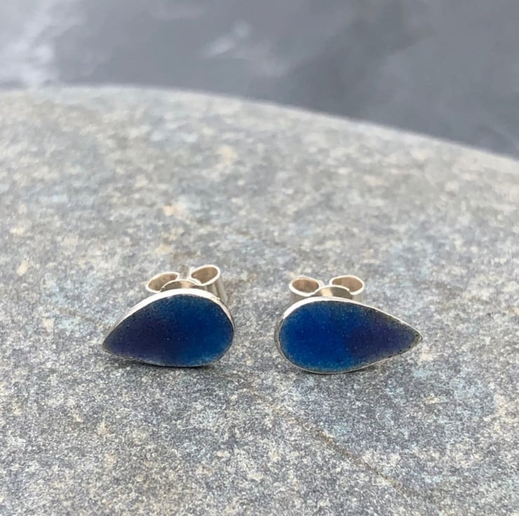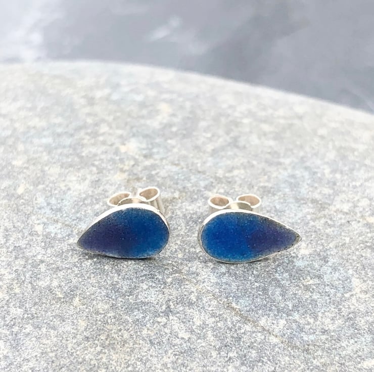 These Enamel Studs have been handcrafted from Sterling Silver and enamels. They are tear drop shaped and the hammered finish can be seen through the transparent blue and violet blue enamels. They measure approximately: 1cm in length. The backs are high polished silver and the posts and butterfly push backs are also Sterling Silver.