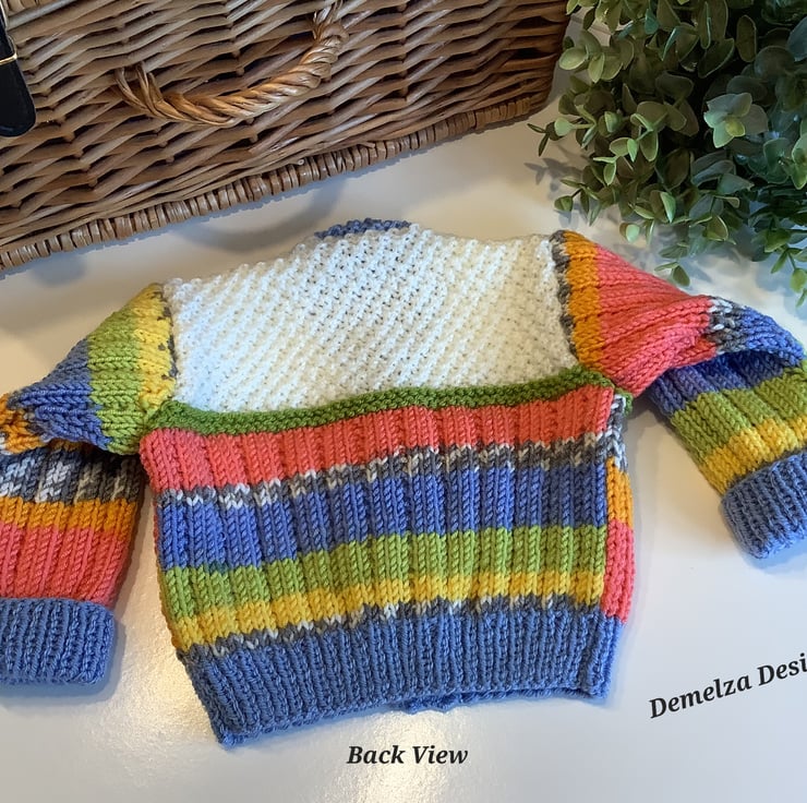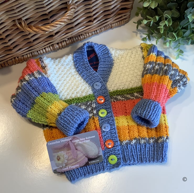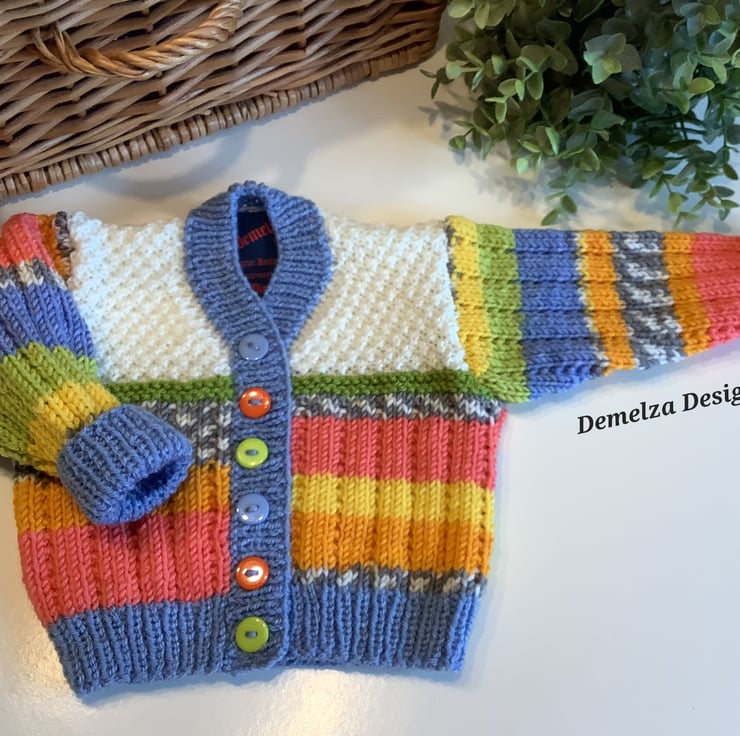 A unique eye catching practical baby cardigan designed for either sex and totally hand crafted in Cornwall using top quality premium branded designer acrylic machine washable yarns. The buttons are made from genuine wood with a sweet sentiment burnt etched on them.The branded Demelza Designs garment label is attached to the back neck edge with the care instructions woven within it on the reverse side for lasting reference. A Demelza Designs garment swing tag will be attached to the front prior to dispatch for a professional touch if gifting.