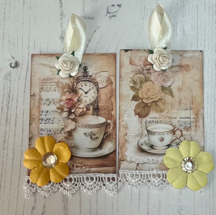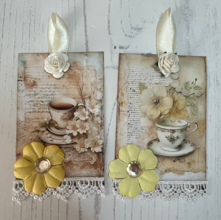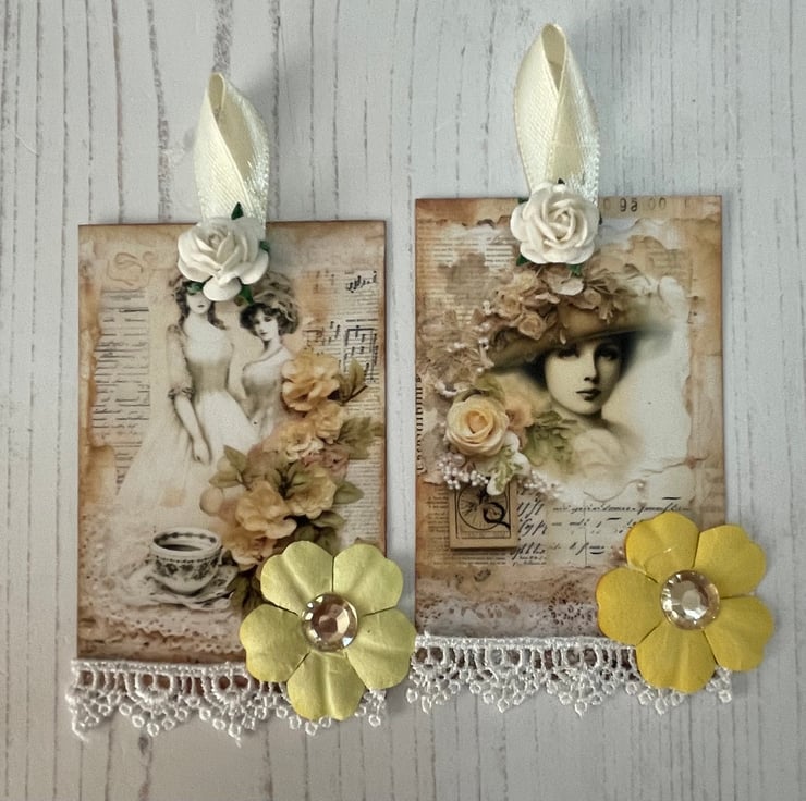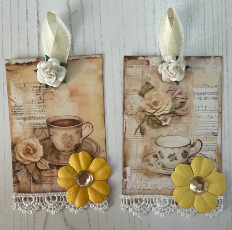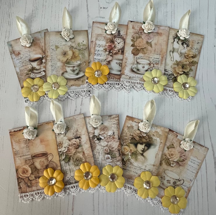 Set of 10 vintage style print tags in pale lemon and cream. Measure approx 3.5” x 2”. Backed with a pale cream collage image. Each tag has a pretty afternoon tea image with cream ribbon tab and an ivory paper rose. Ivory guipure lace with a yellow flower in various shades and a diamanté centre.