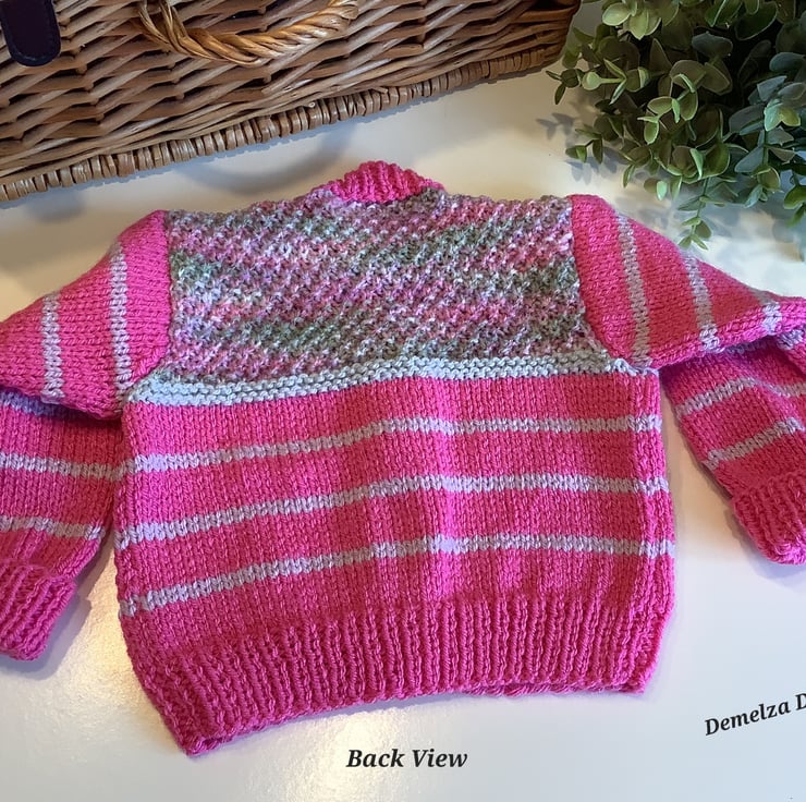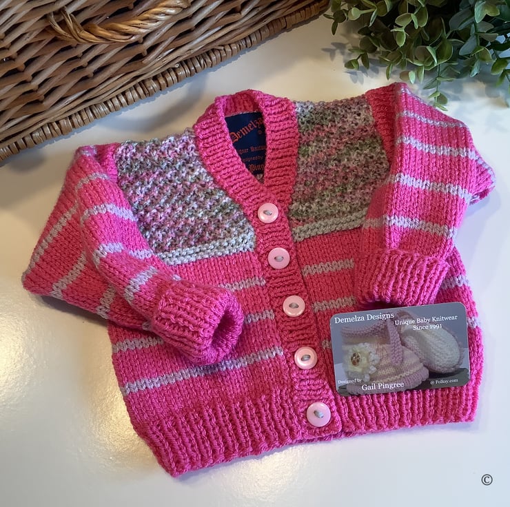 A unique eye catching practical baby girl's cardigan designed and totally hand crafted in Cornwall using quality premium branded acrylic machine washable yarns. The branded Demelza Designs garment label is attached to the back neck edge with the care instructions woven within it on the reverse side for lasting reference. A Demelza Designs garment swing tag will be attached to the front prior to dispatch for a professional touch if gifting.