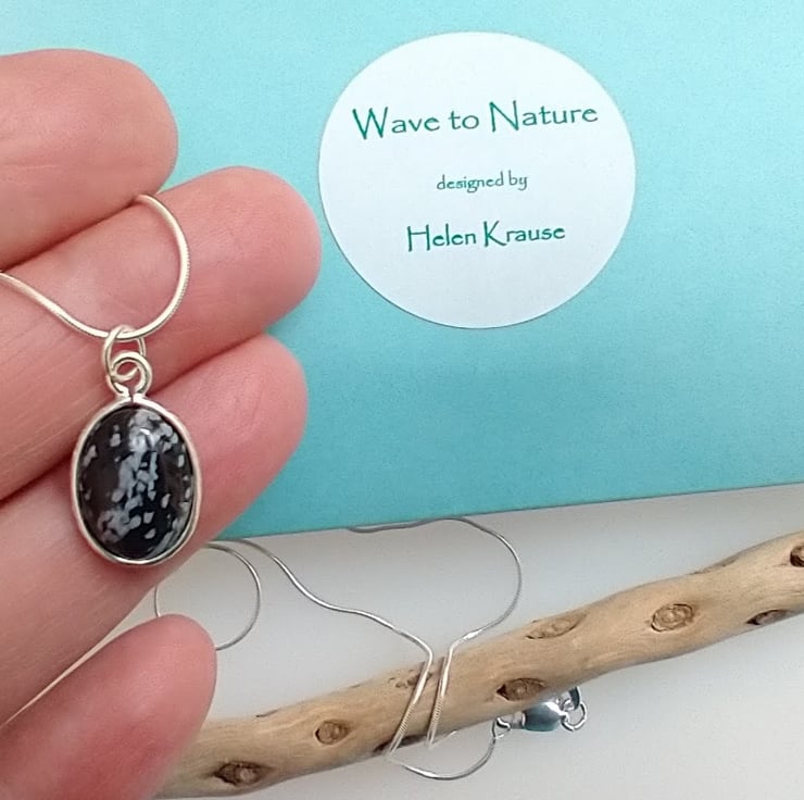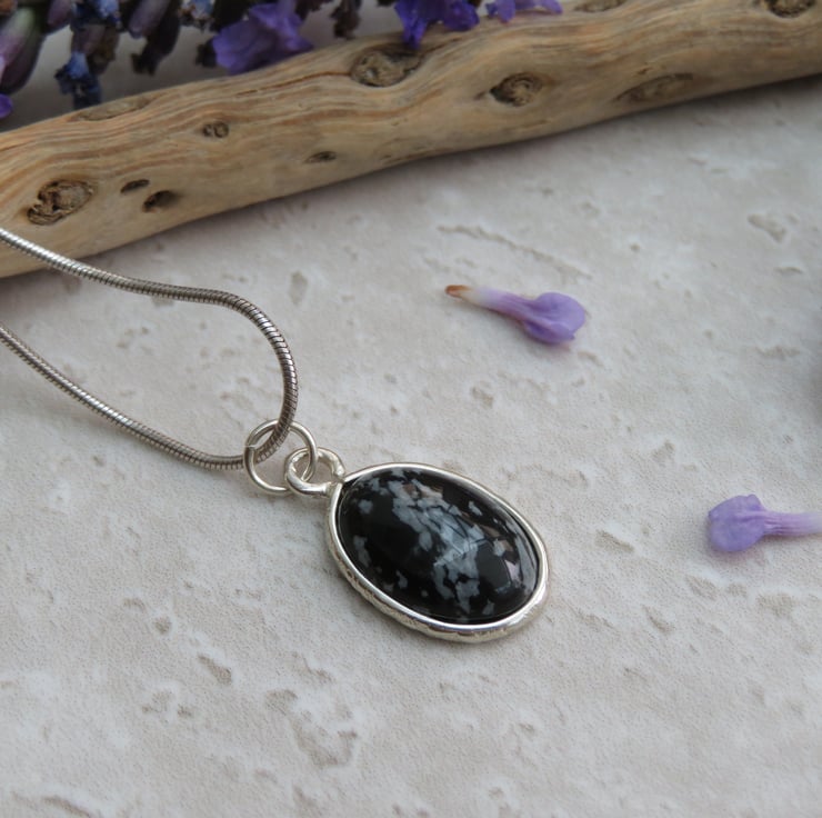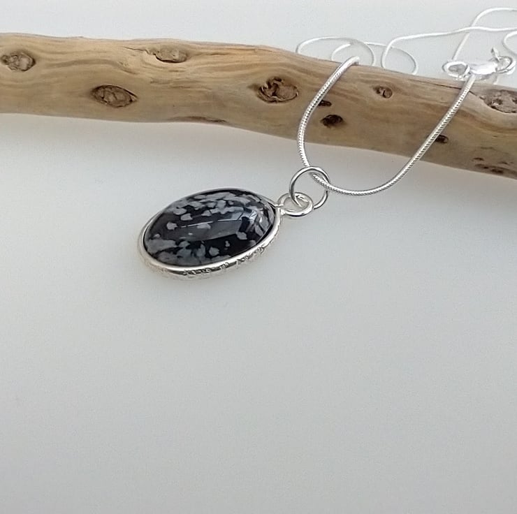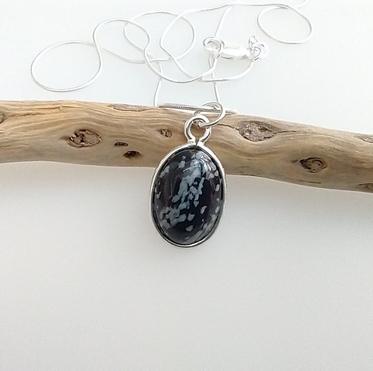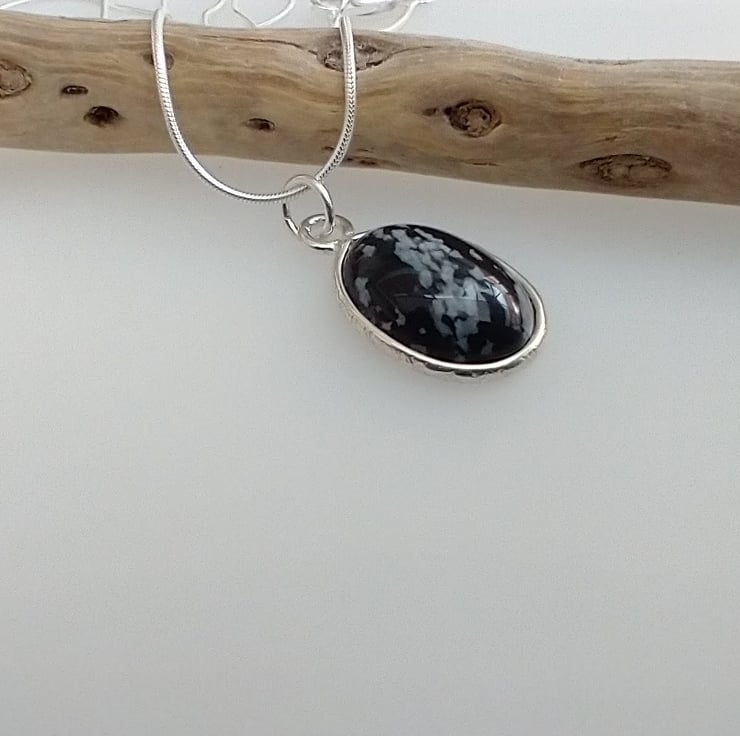 This stunning snowflake obsidian necklace has been made with a black and grey polished cabochon that has been secured in a decorative sterling silver mount and hangs from a sterling silver snake chain. A pretty shiny black gemstone necklace which goes well with most colours and would look smart with a white shirt and black suit. This would make a lovely thoughtful birthday gift for someone special.