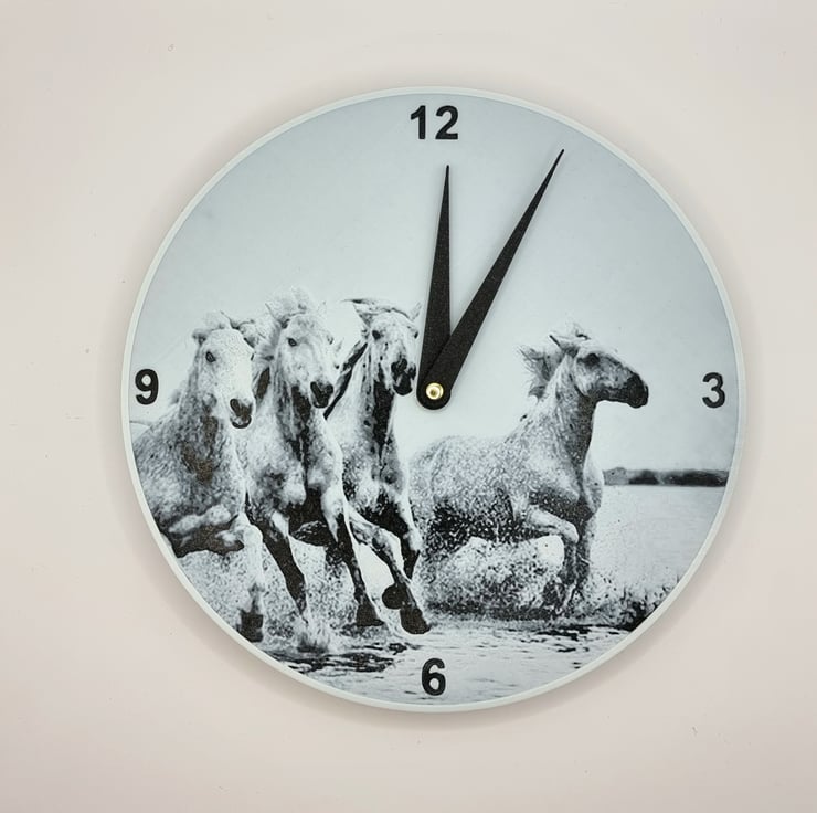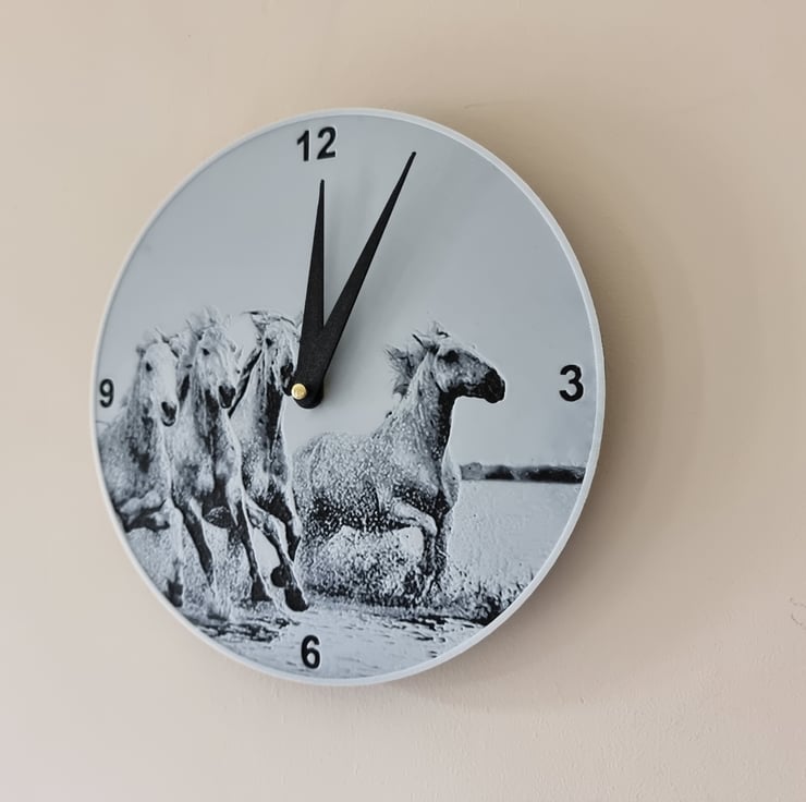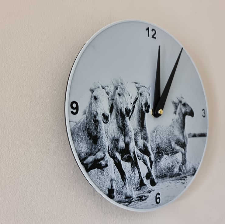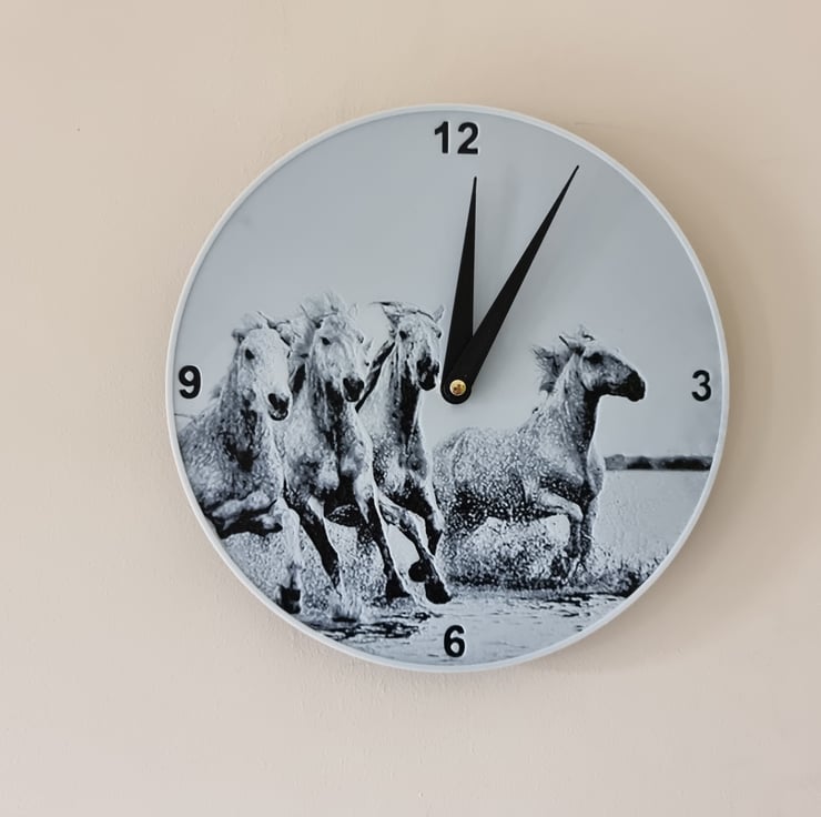A clock featuring horses running through water. It is made from strong recyclable plastic and the colours are added in layers to form the image which is slightly raised from the clock face. Comes with a quartz silent clock mechanism so no annoying ticking sounds. Uses 1 x AA battery, not supplied.