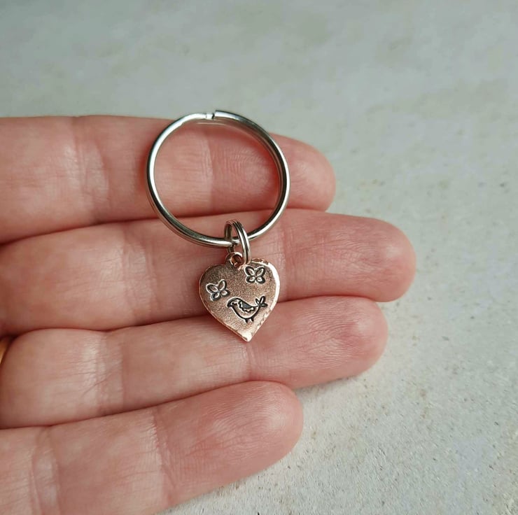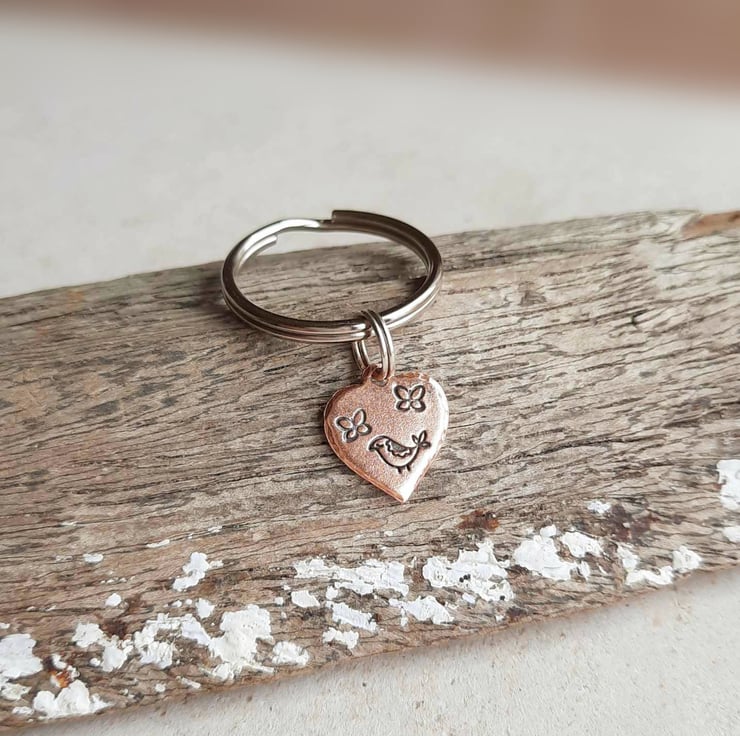 This small heart shaped copper key ring is hand stamped with a pretty bird and butterflies design and the edge is gently hammered to add a pretty texture. The charm is oxidised with a patina to highlight the details.