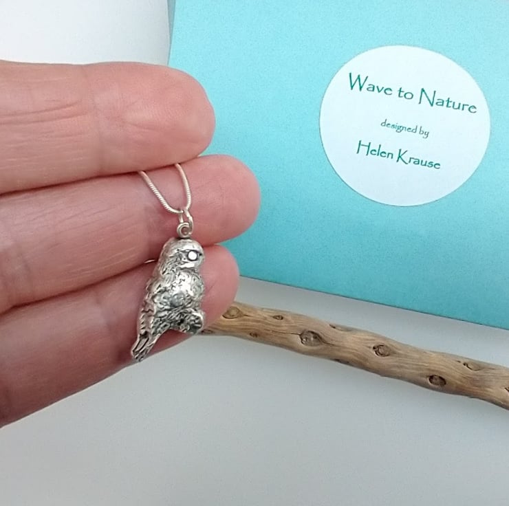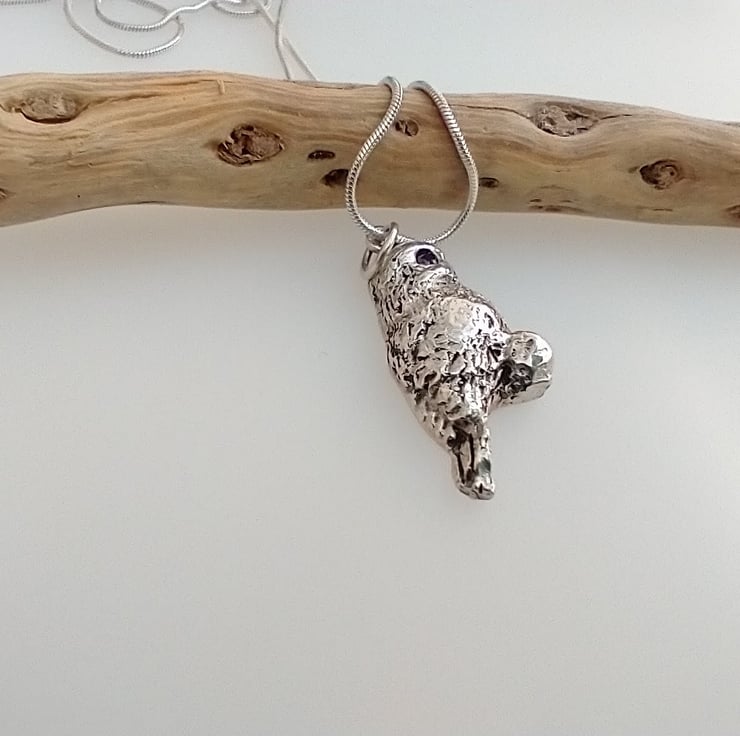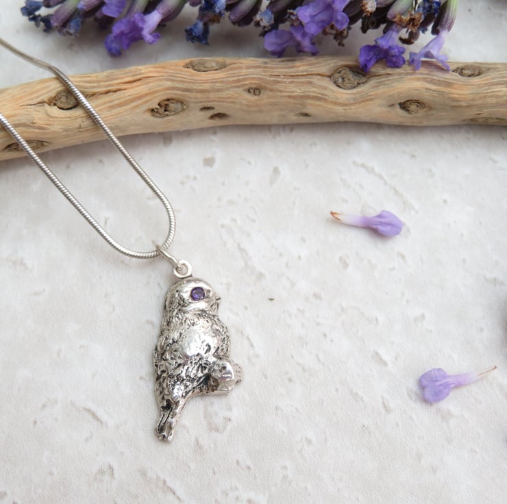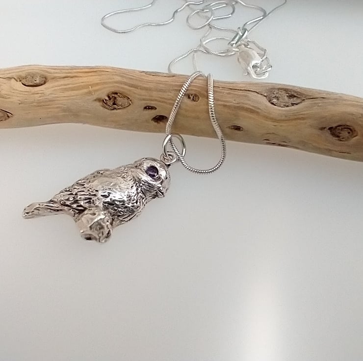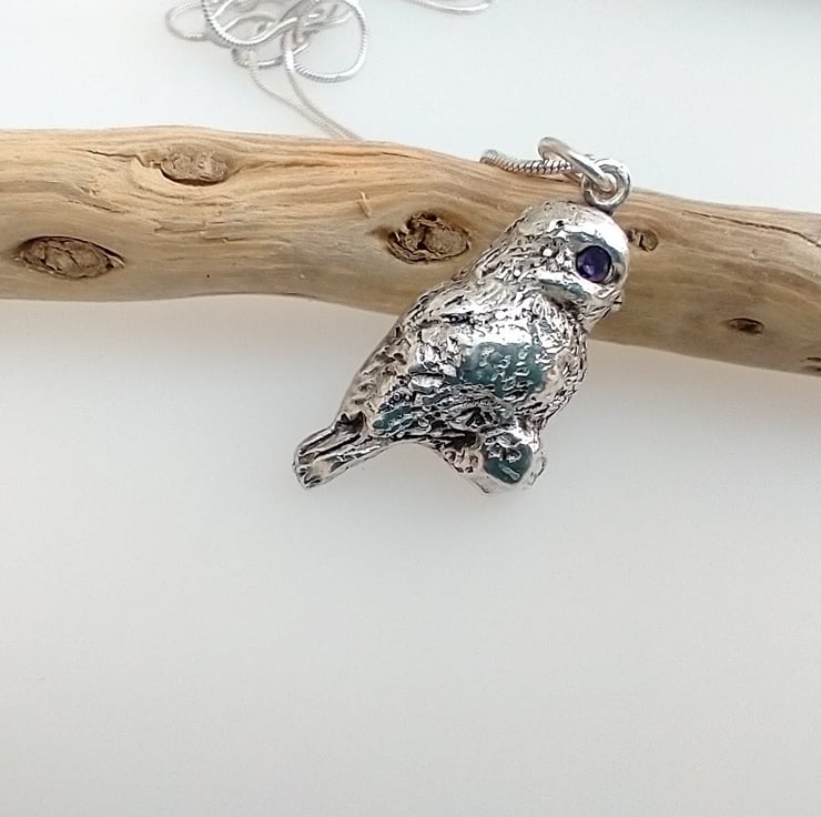 This is a cute fine silver baby bird necklace made from a detailed mould of a fledgling blue tit waiting for it's parent to return. It has been sanded and polished by hand and oxidised to highlight the fine detail. The eye is made with a tiny faceted amethyst gemstone and the pendant is suspended from a sterling silver snake chain.