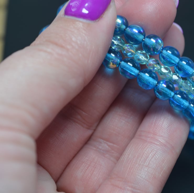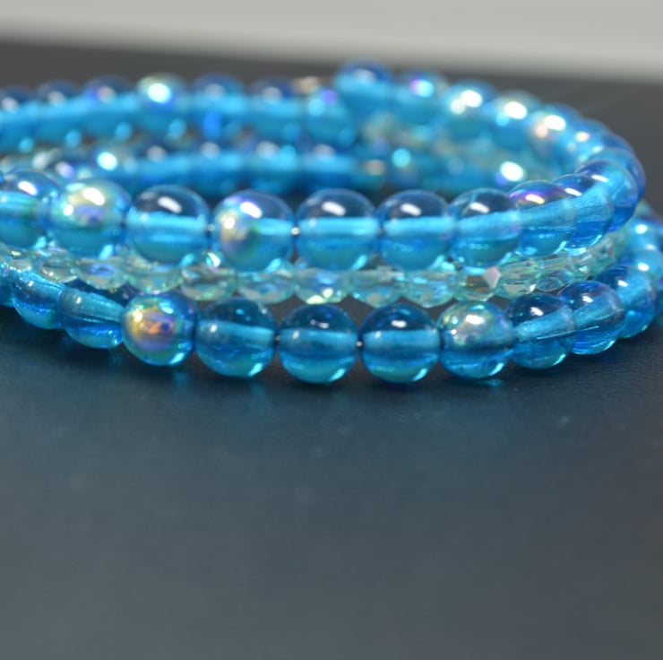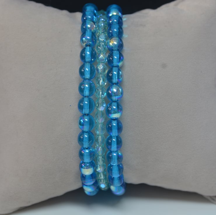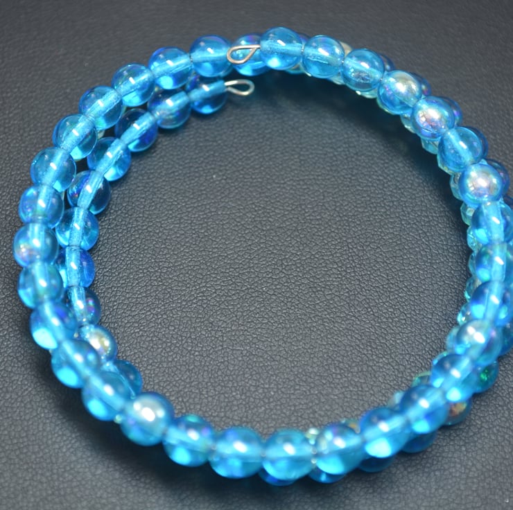 The bracelet is made from light blue metallic round beads and the centre of the bracelet is light blue fire polished beads. The beads are on a wire that is designed to wrap around the wrist and stays in place without requiring being fastened. The bracelet will wrap around the wrist 3 times.