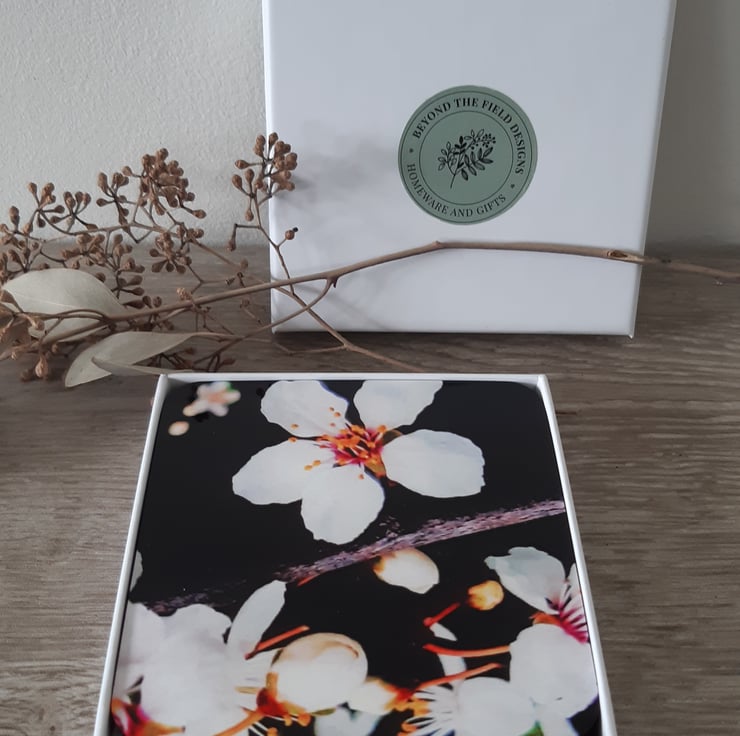 Set of 4 blossom print coasters beautifully presented in a gift box.