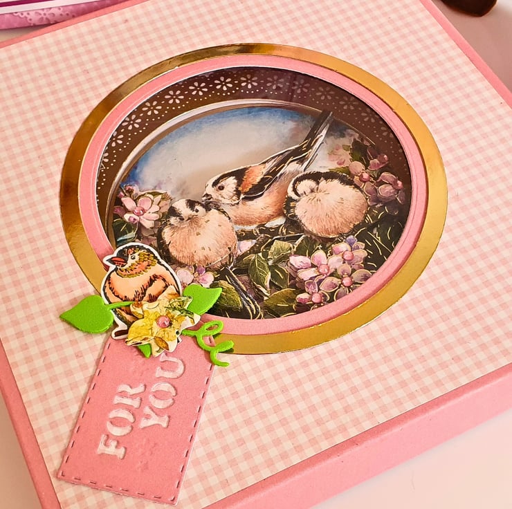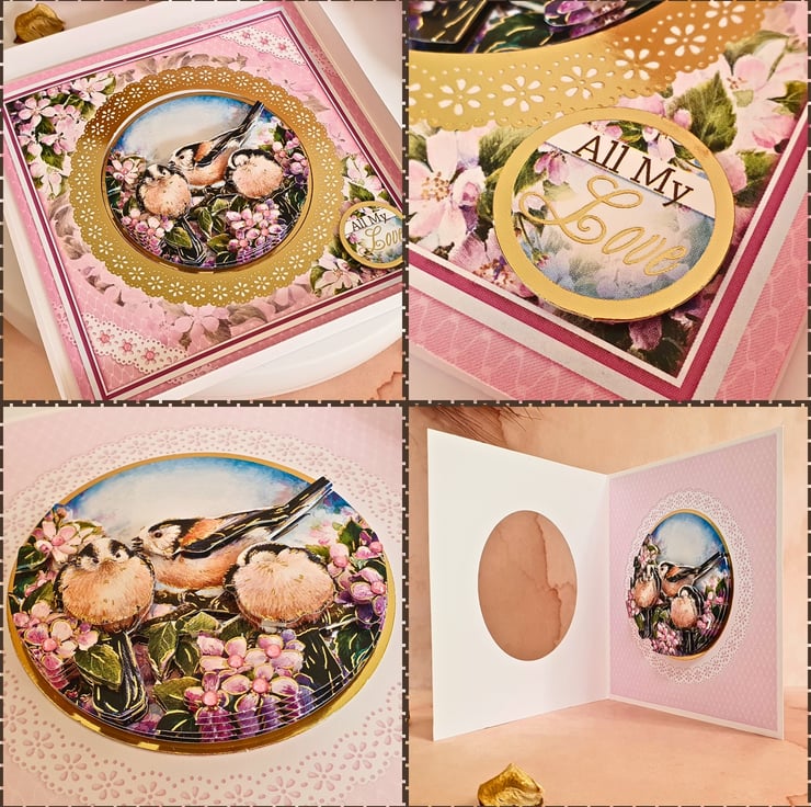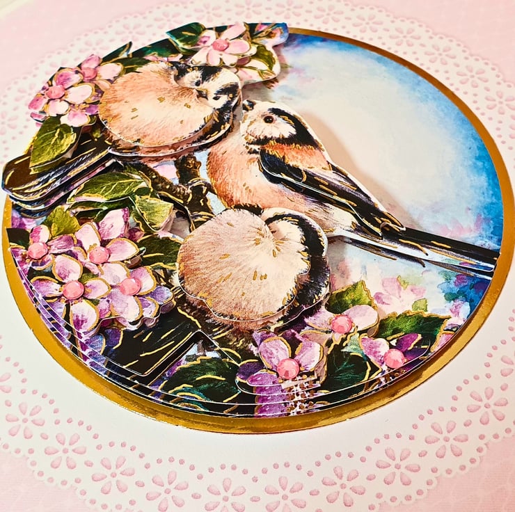 The main decoupaged topper of Chaffinch birds & pink flowers, is made with up to 4 layers of cardstock and it is placed on the centre of the inside card panel. The 3D topper is also embellished with pink diamante gemstones on the flower centres, and pops through the aperture window.