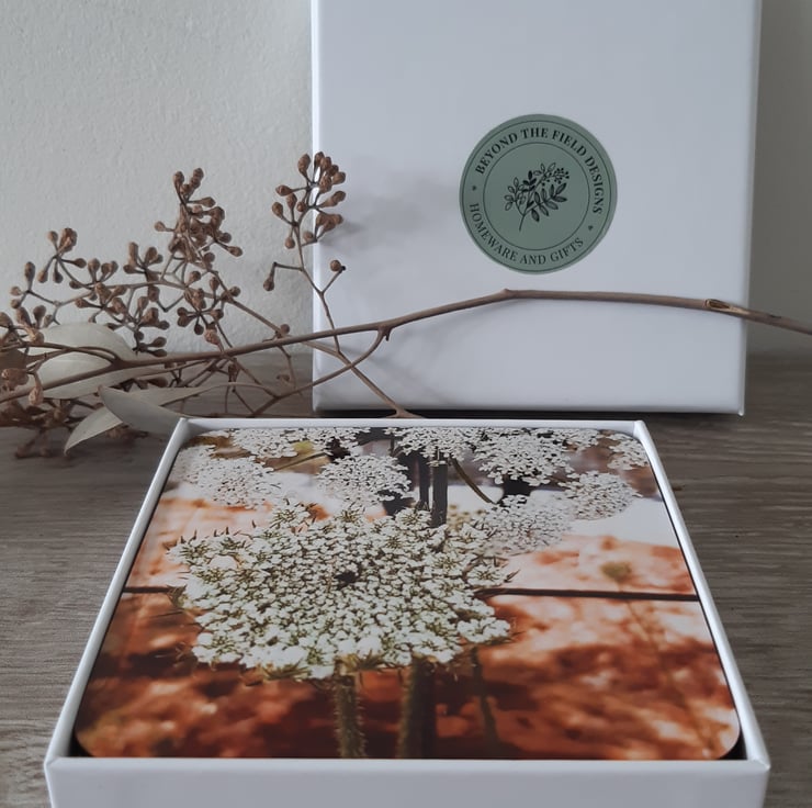 Set of 4 Queen Anne's Lace print coasters beautifully presented in a gift box. The coasters measure 10cm x 10cm and are 3mm thick. Made from hard wearing mdf with a glossy finish and cork backing. Designed and made by Beyond the field designs in the Staffordshire Moorlands using my original photographic design. Wipe clean only please.