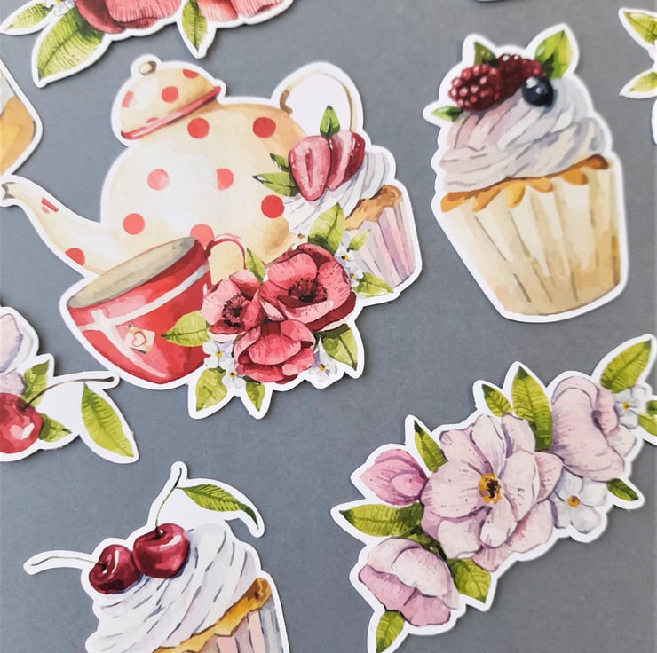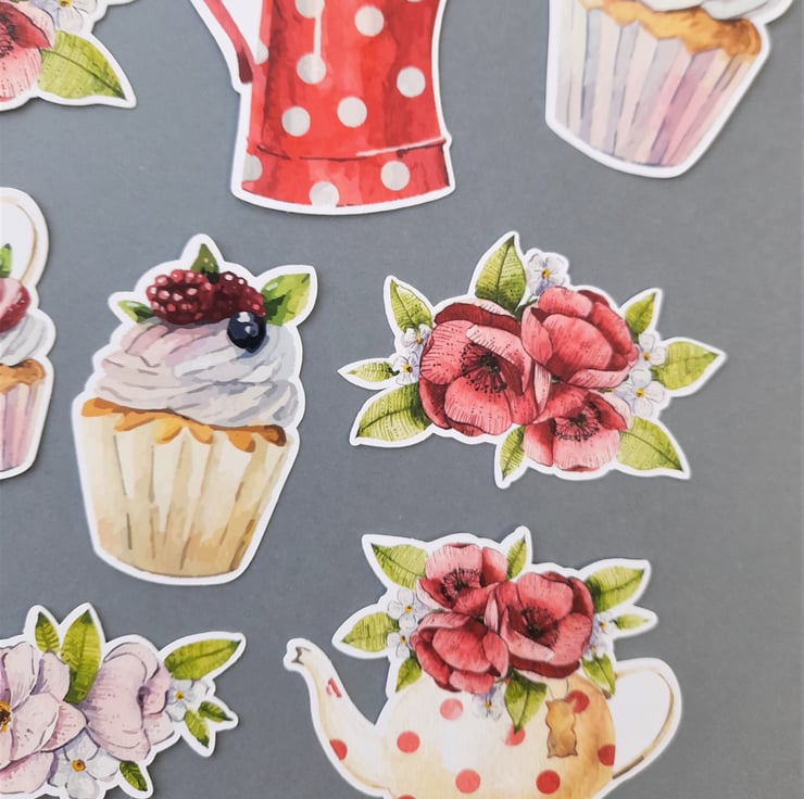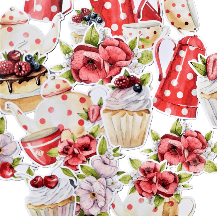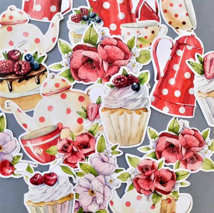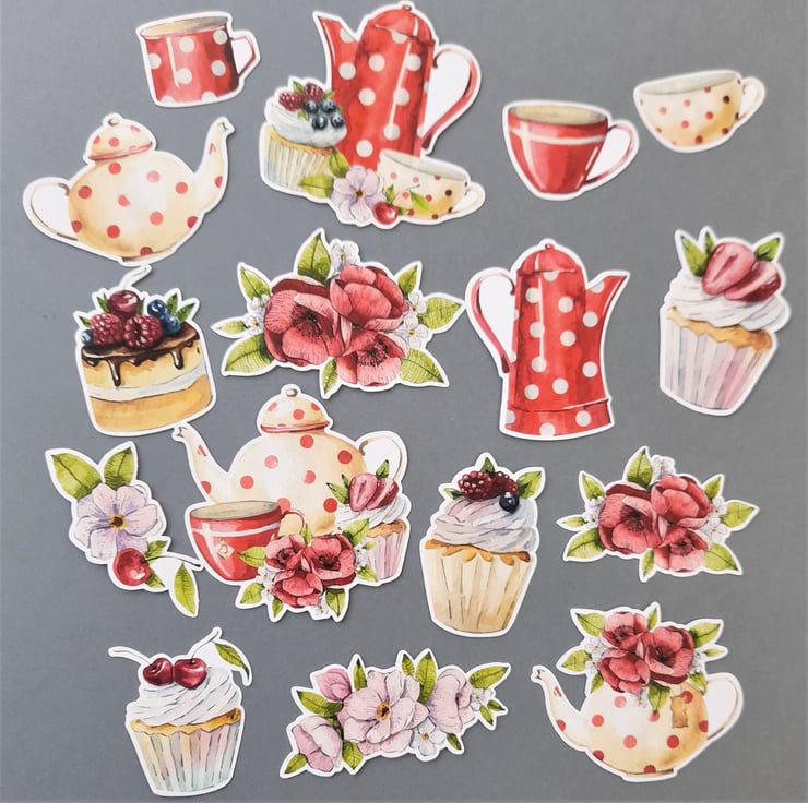 One set of handmade ephemera / embellishments with an afternoon tea theme printed in vibrant colours onto 250gsm cardstock. Wonderful for card making, scrap booking, journaling, etc. There are 16 pieces in the set. To give an indication of size, the small red and white mug is 3cm tall and the single red and white coffee pot is 6.5cm tall.