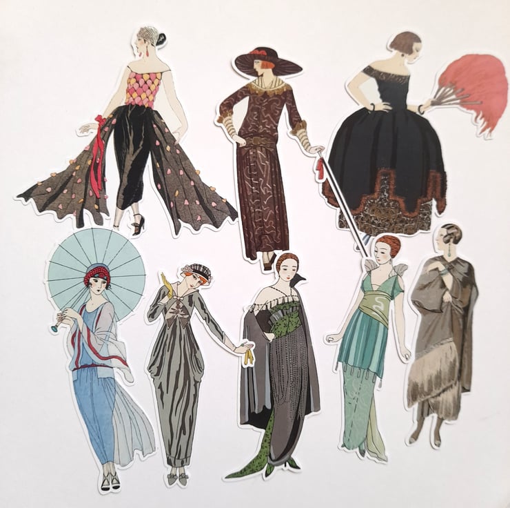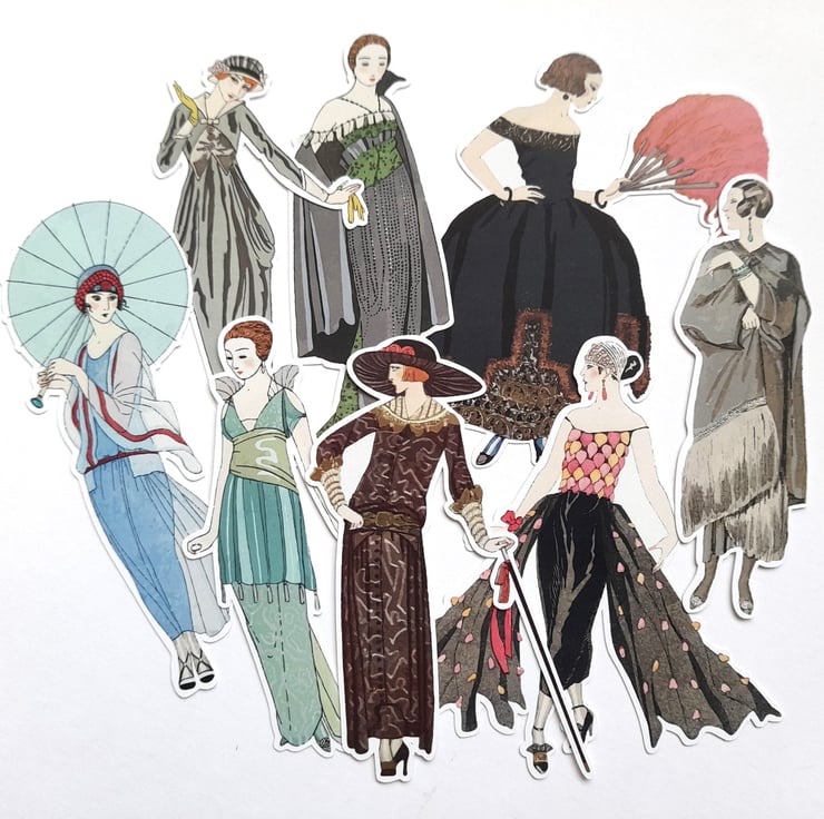 One set of handmade vintage, art nouveau fashion model die cuts / embellishments made from 250gsm silk card. Wonderful for card making, scrap booking, junk journaling, etc. There are 8 pieces in this pack. Sizes vary slightly but to give an idea of size they are approx. 10cm tall.