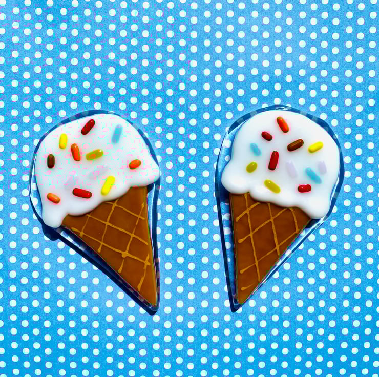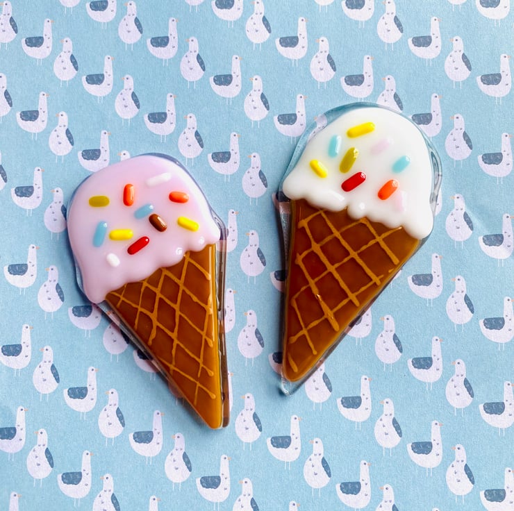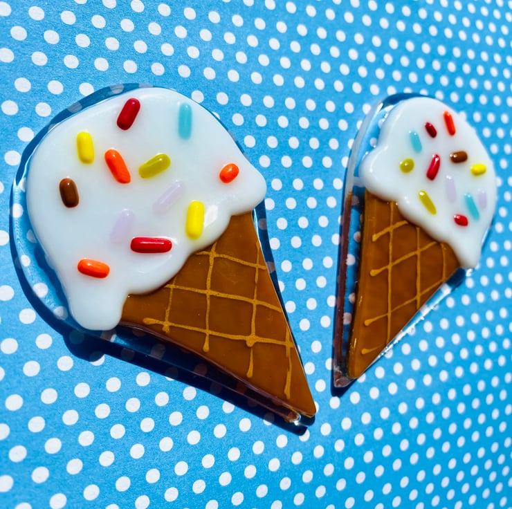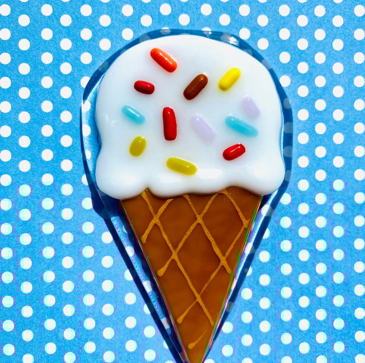 Handmade ice cream fridge magnet made of fused glass .