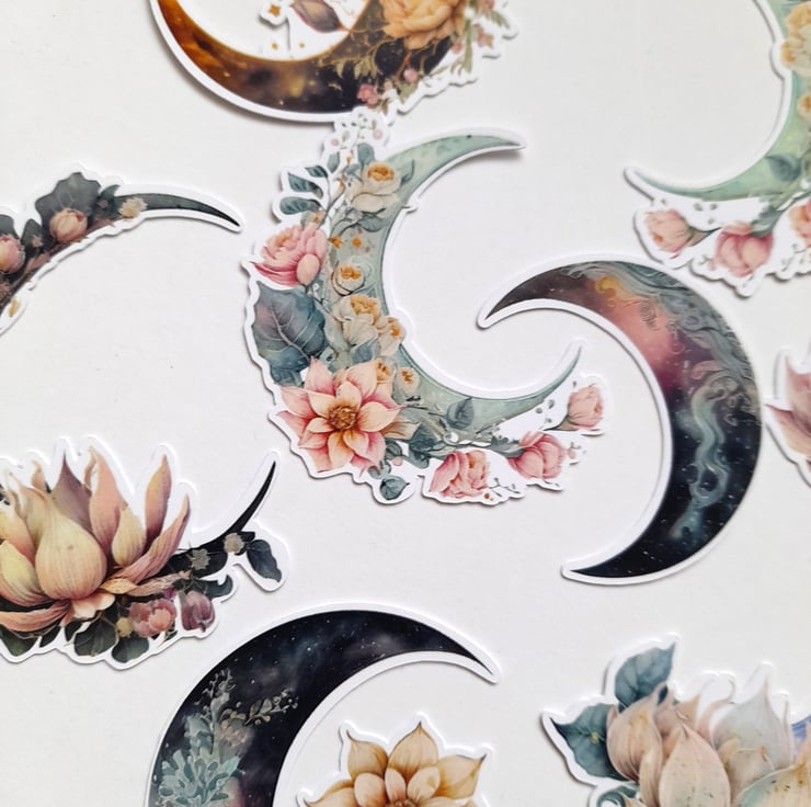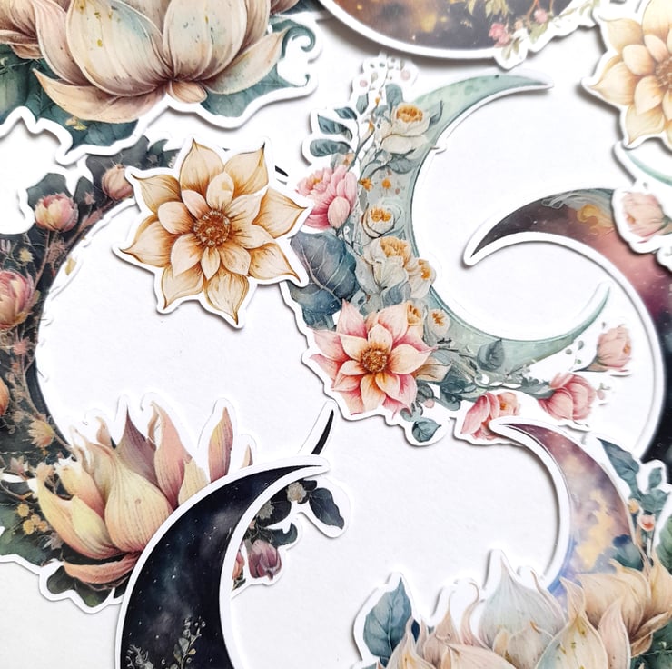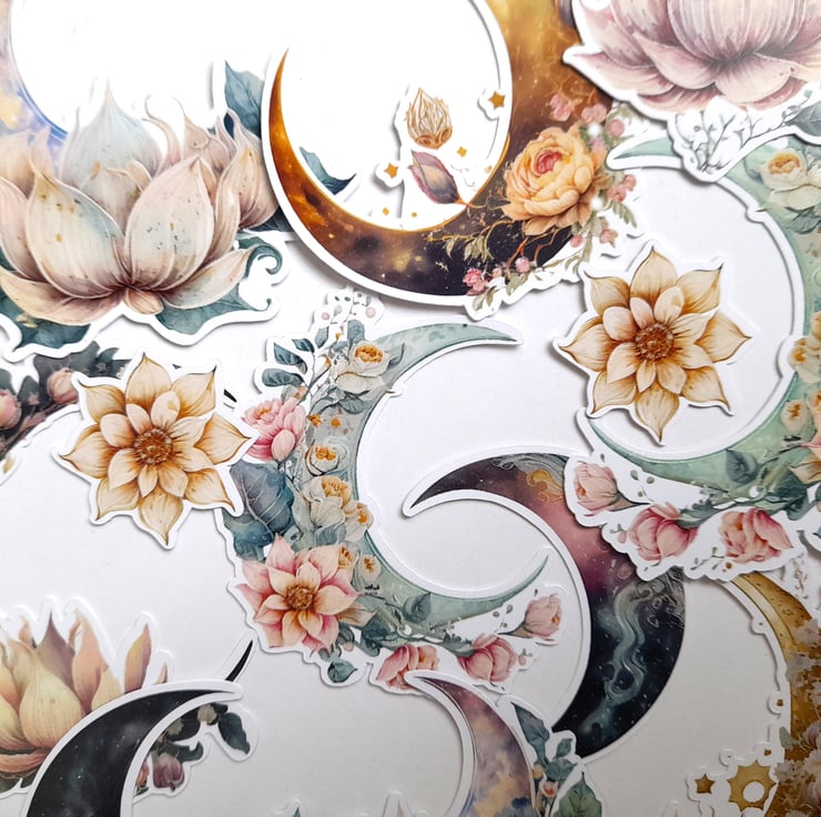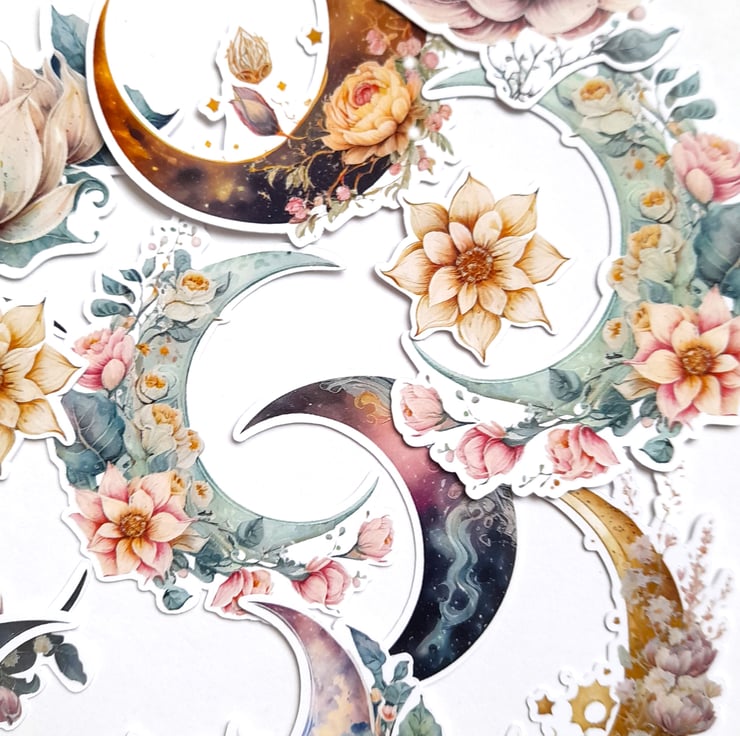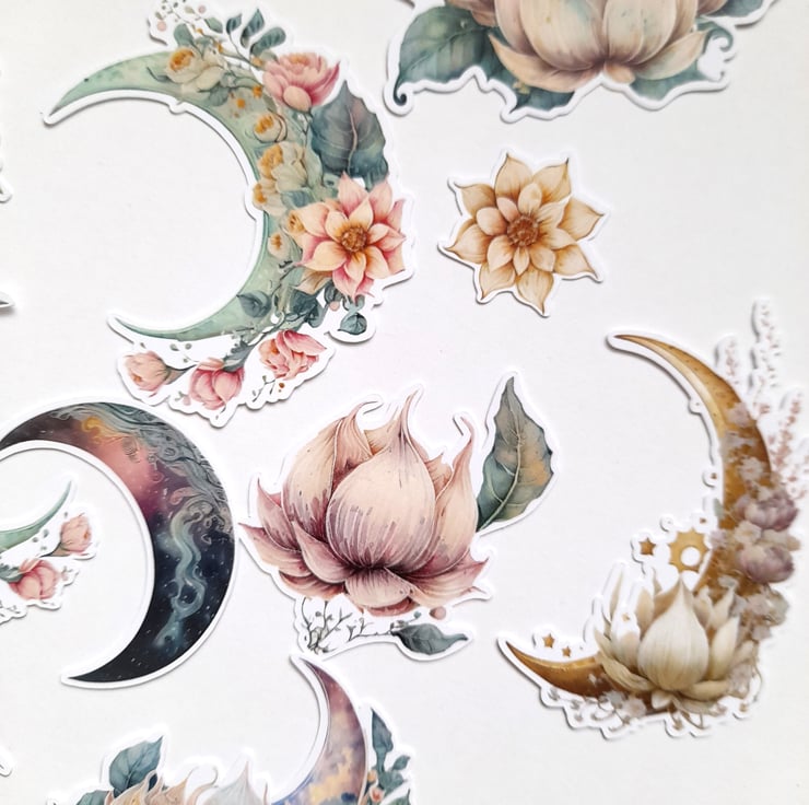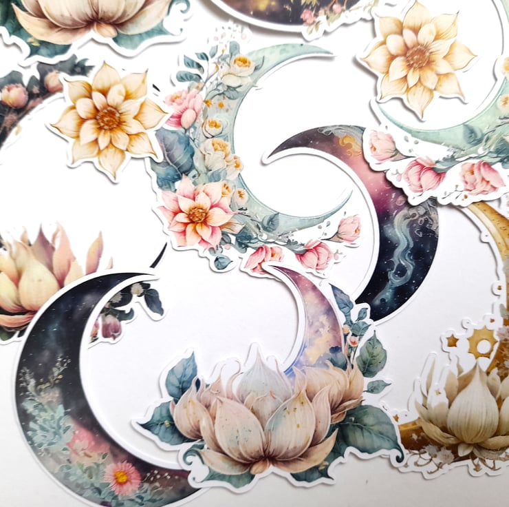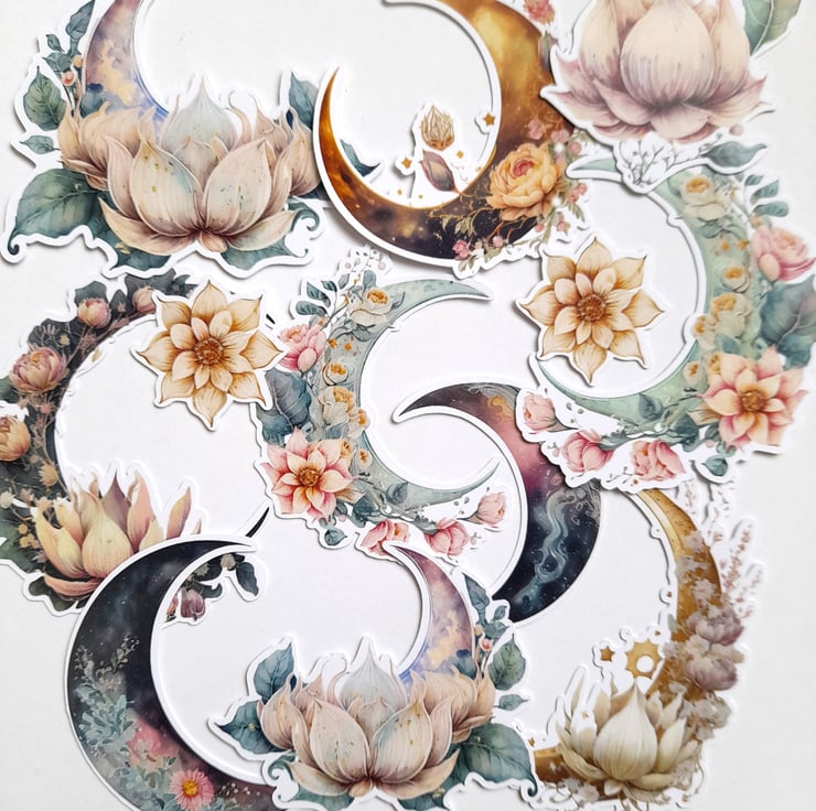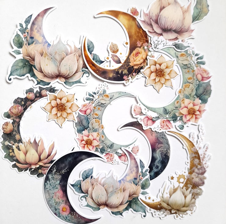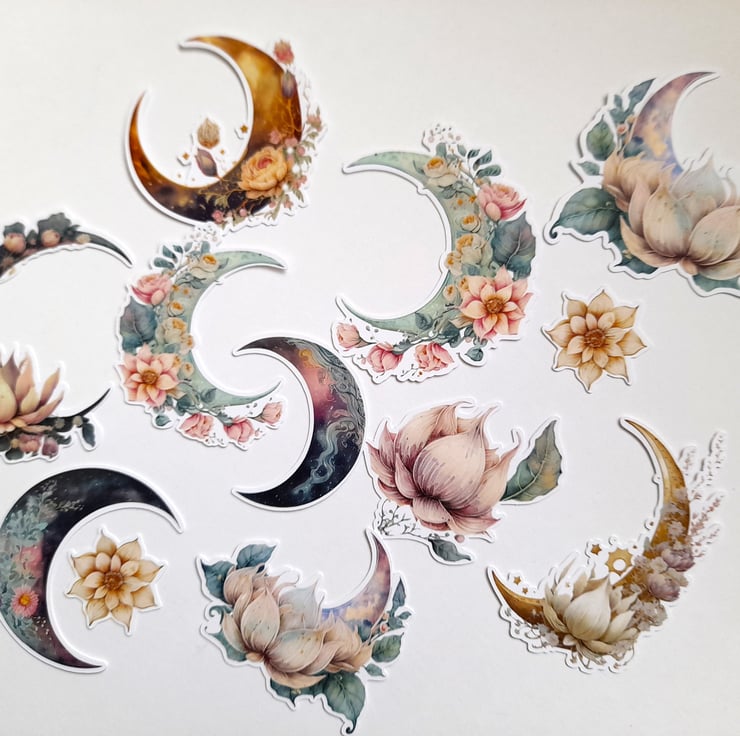 One set of die cuts / ephemera / embellishments with a pretty flower moon theme printed onto 250gsm silk card. Handmade. Wonderful for card making, scrap booking, junk journaling, etc. There are 12 pieces in each pack. Sizes vary, but to give an indication of size, the larger dark moon is 6cm tall.