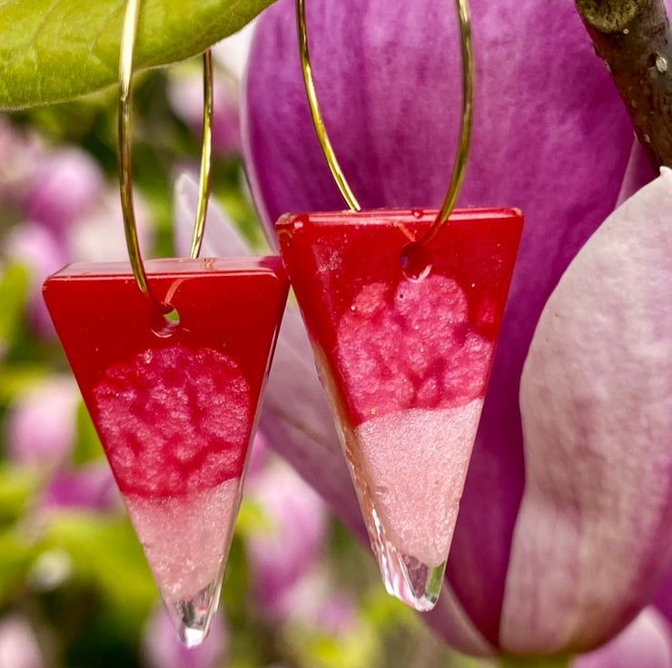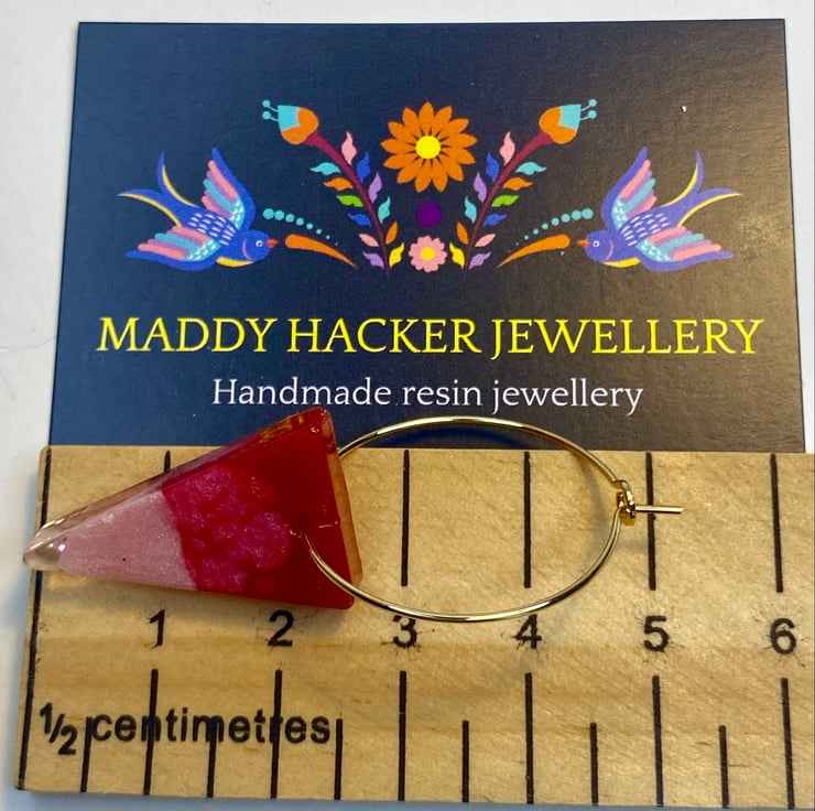 The 18k gold plated hoops are 2.5cm in diameter and the resin triangle is 2.5cm, total drop length is 5m.