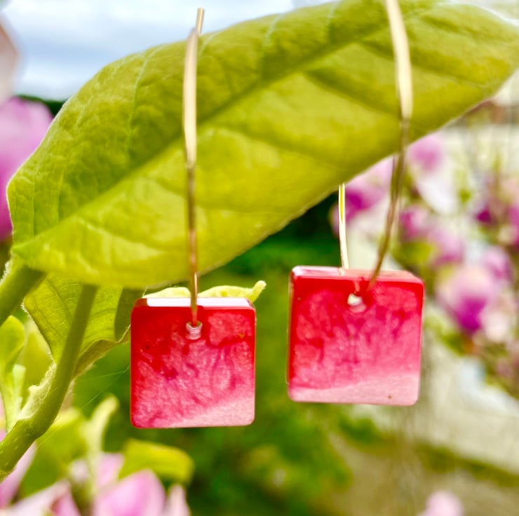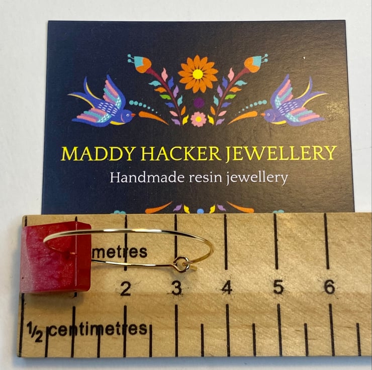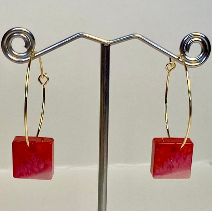 The 18k gold plated hoops are 3cm in diameter and the resin square is 1cm, total drop length is 4cm .