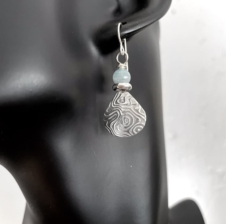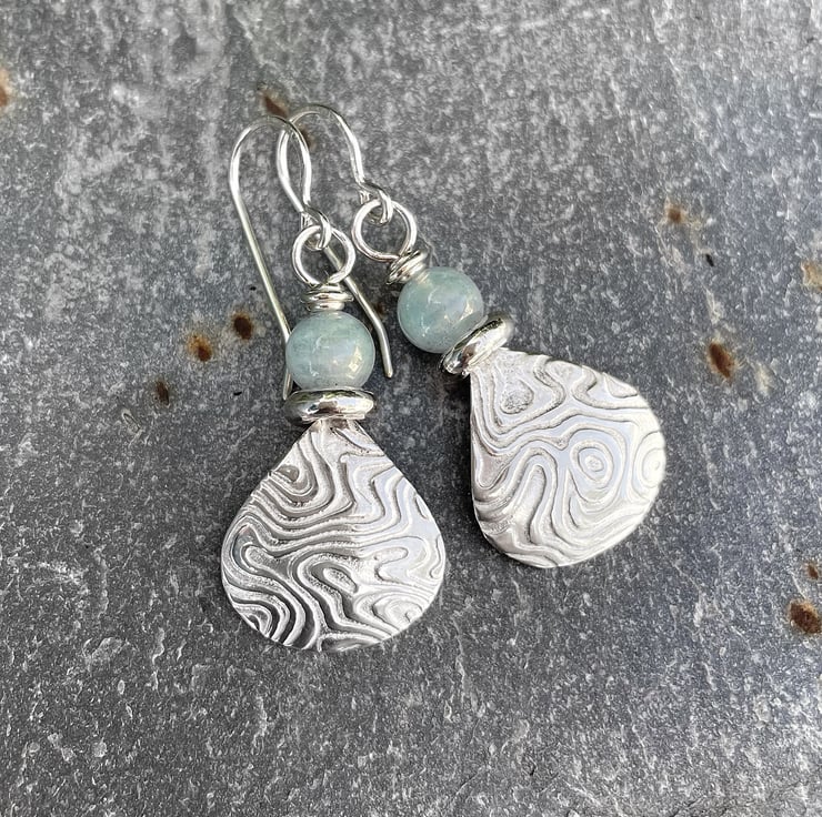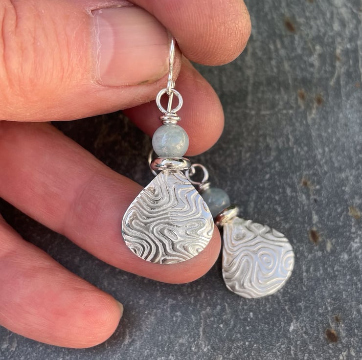Textured sterling silver and aquamarine earrings on handmade hooks.