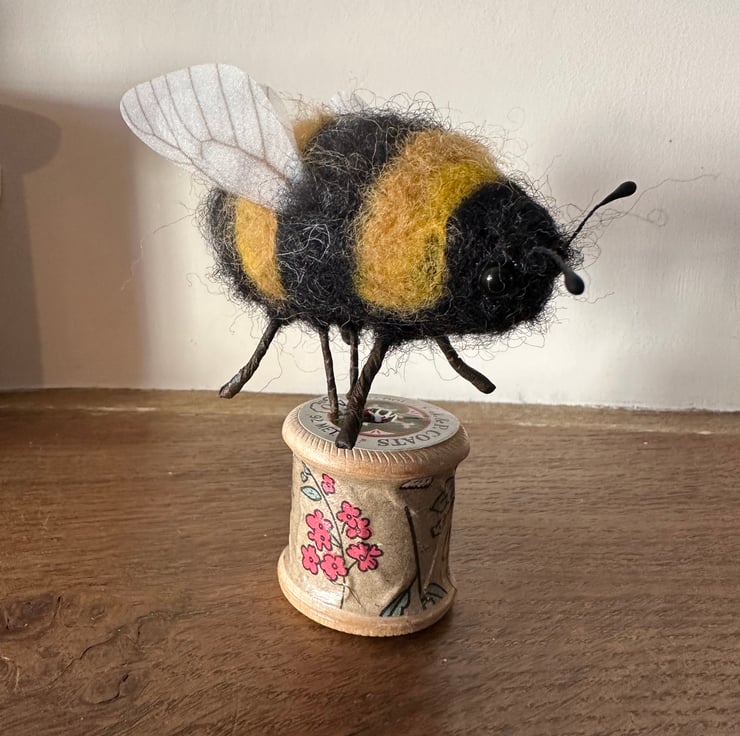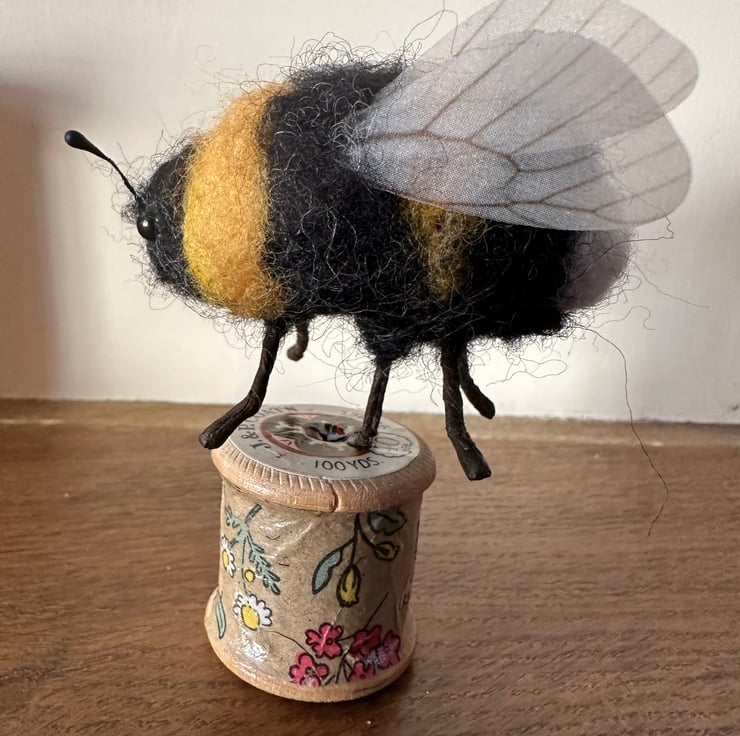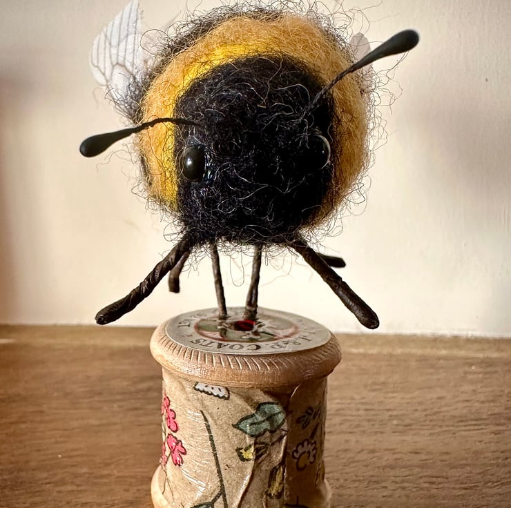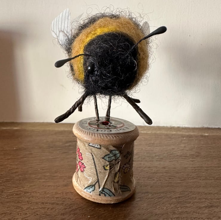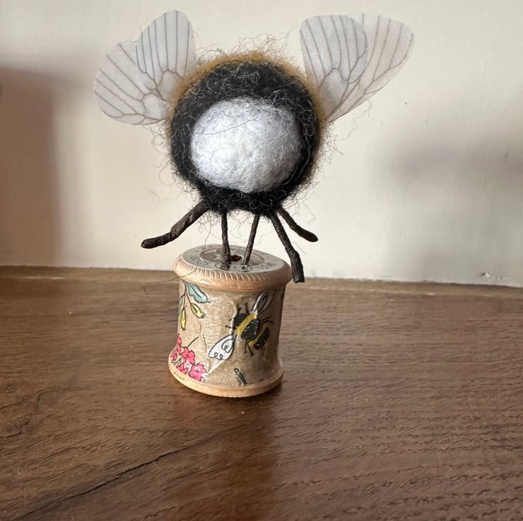 Needle felted wool with bead eyes , fabric wings and wire and paper legs, attached to a wooden bobbin which has been decorated with craft paper