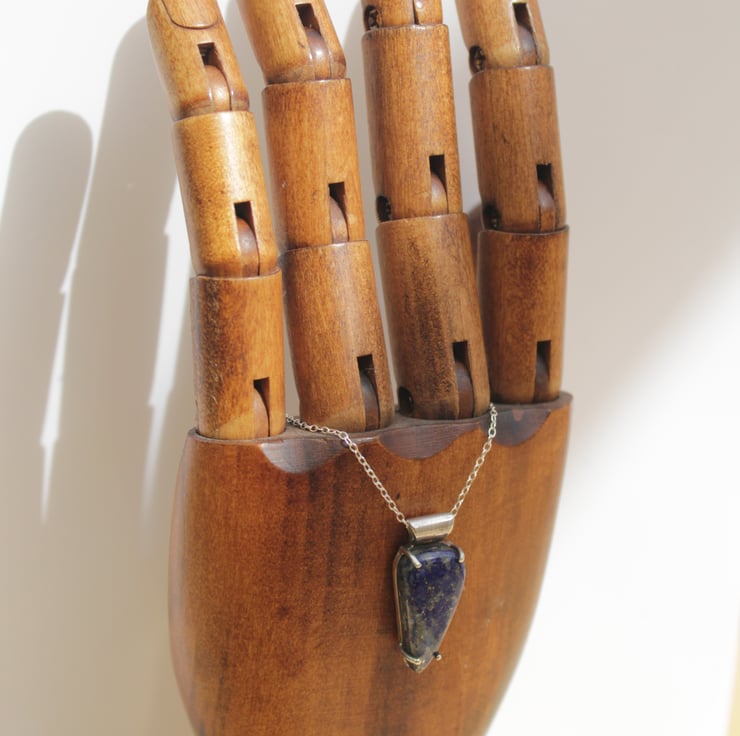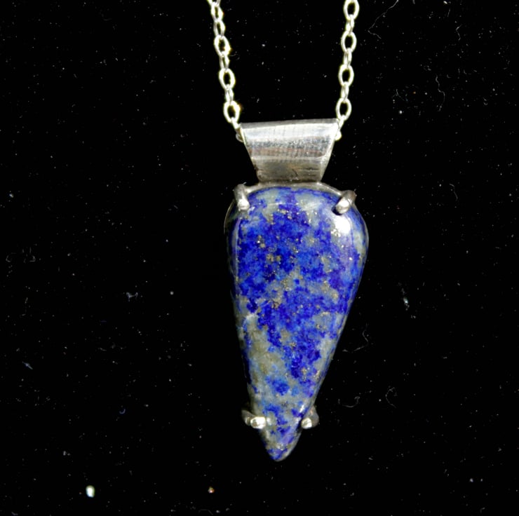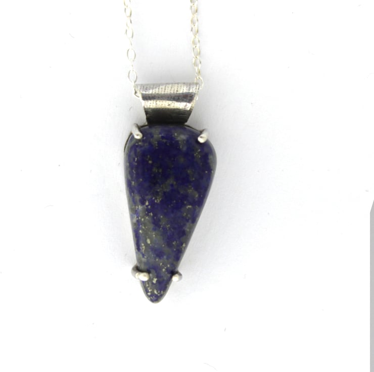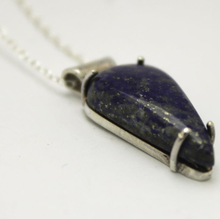 One off - 'Heart shaped' vivid blue and gold Lapis Lazuli gemstone mounted on a Sterling Silver pendant. The gem is held in place using four claws/prongs so the beauty of the stone is not obscured. The back is also cut out to reveal this amazing stone. Attached via a stylish bail to a slender trace chain of 40cm .