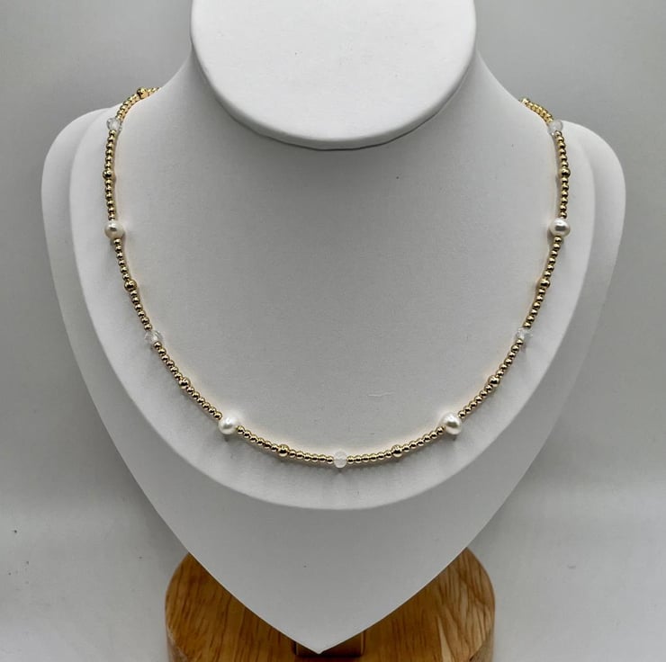 14 ct gold filled necklace with fresh water pearls and AA quarzt crystals. Ideal for a wedding necklace