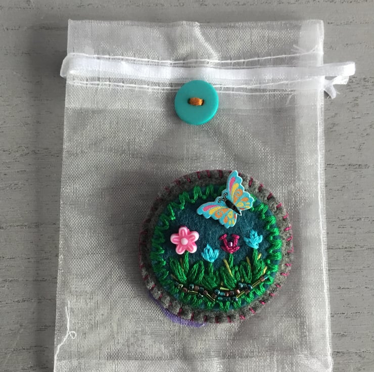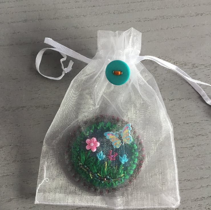 This Hand Embroidered Garden Brooch is gift wrapped in an organza bag, decorated with a button. A protective bag to keep the brooch in when not worn. An ideal birthday, retirement, friendship or thank you gift……especially for gardeners…..or a gift for yourself.