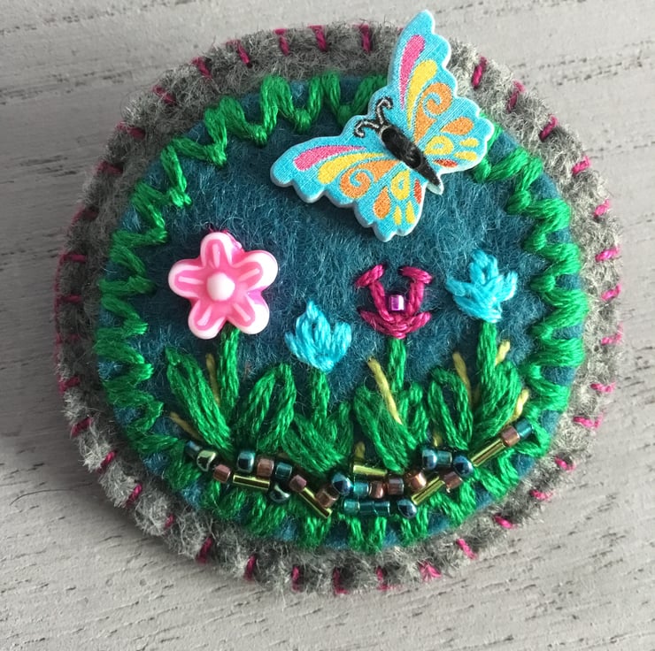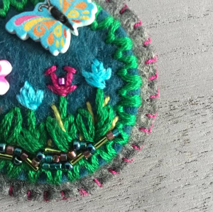 This Hand Embroidered Garden Brooch has a lovely garden scene. A wooden Butterfly button flutters over a border of rose pink and blue flowers in the garden. These flowers are hand embroidered in Lazy Daisy, Straight and Fly Stitches on circles of jade and grey felt, with green and blue bugle and seed beads. The brooch is edged in pink Blanket Stitches.