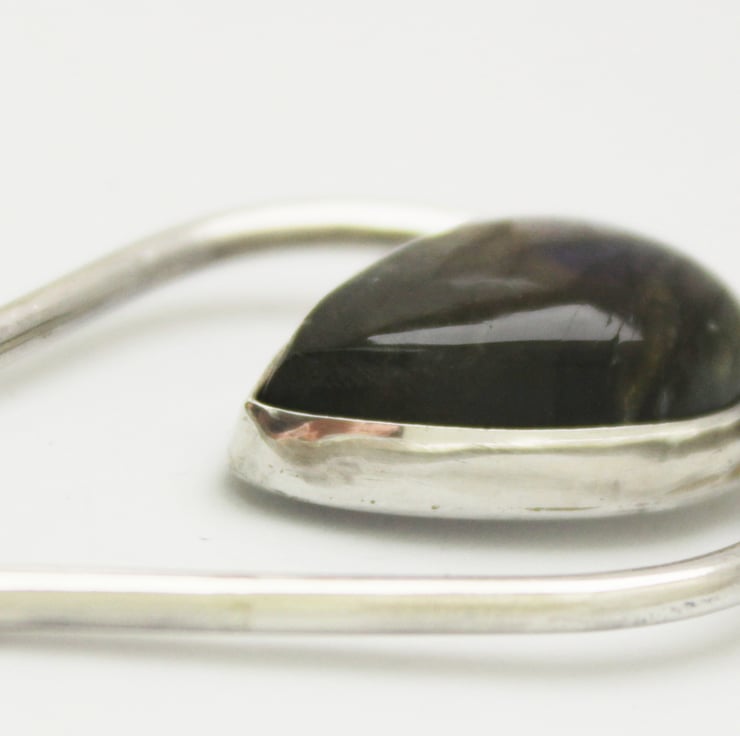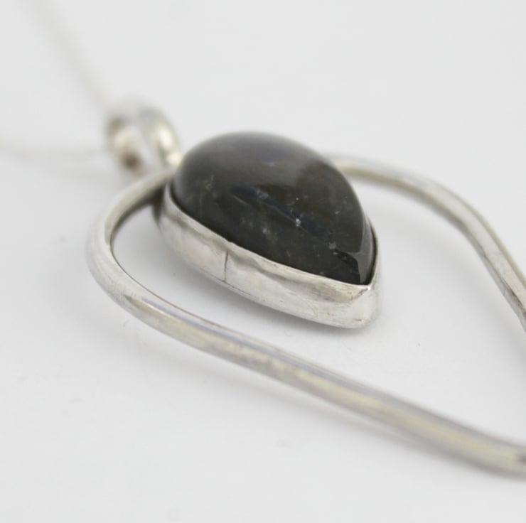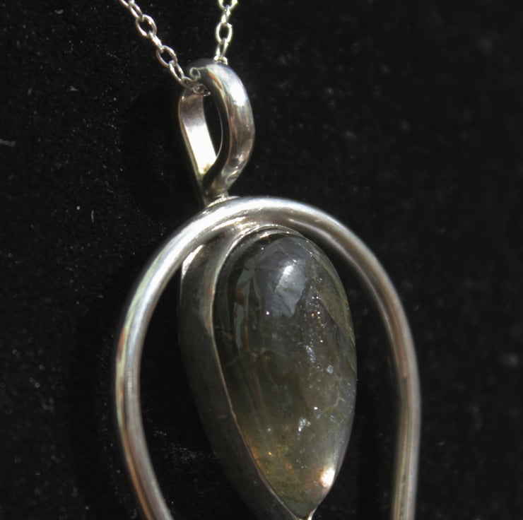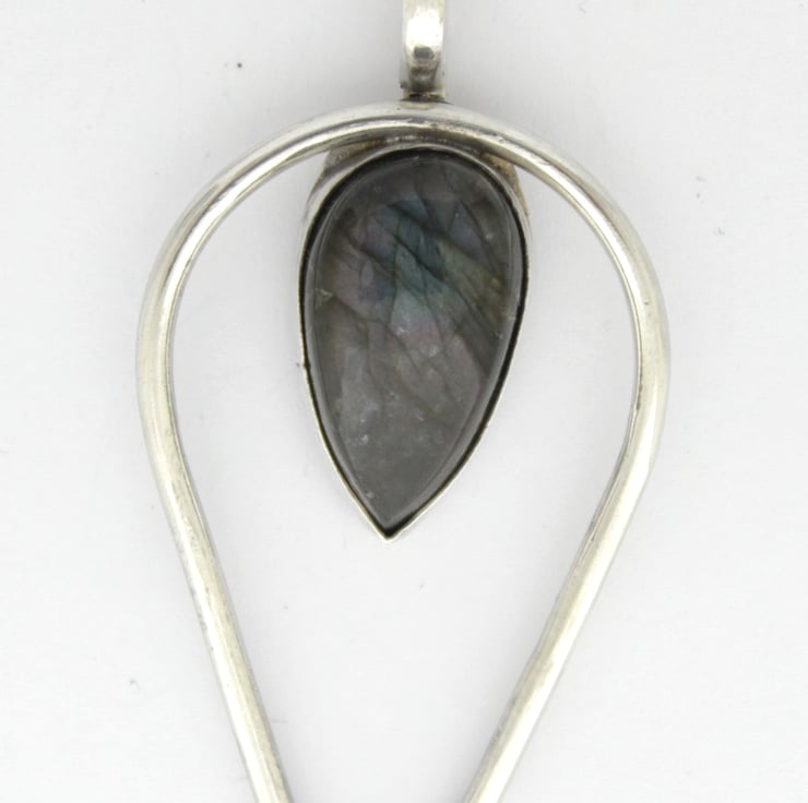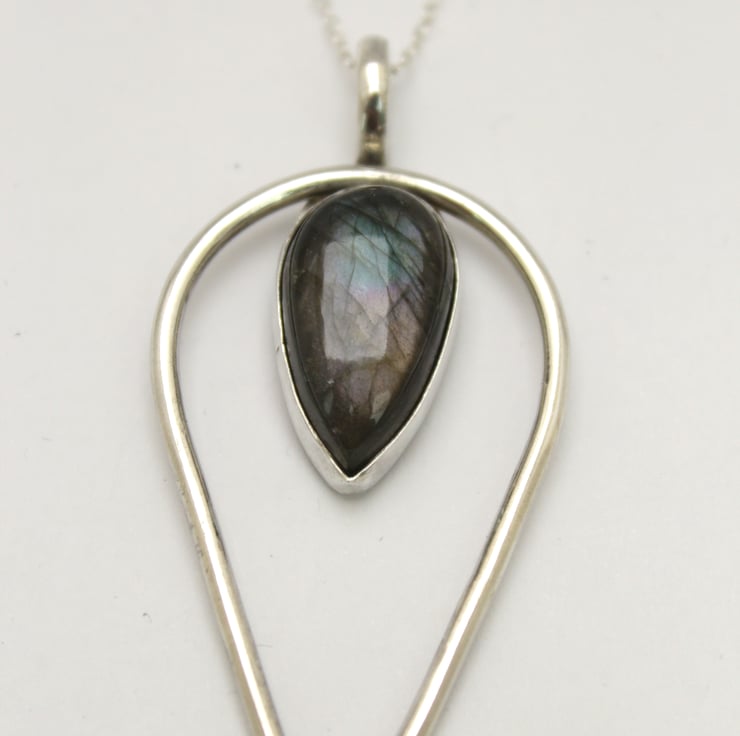 This unique Hand Made pendant is made entirely from Sterling Silver. The inverted tear drop outer form frames a bezel set Labradorite semi precious gemstone. The gemstone adds green, blue, purple flashes of colour to this statement piece