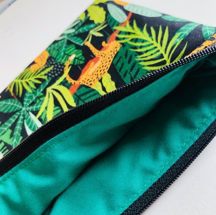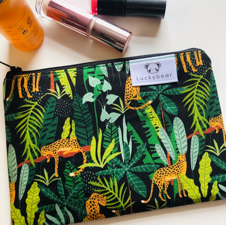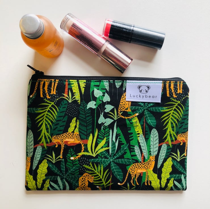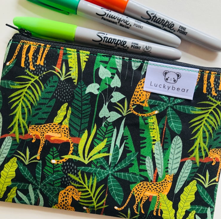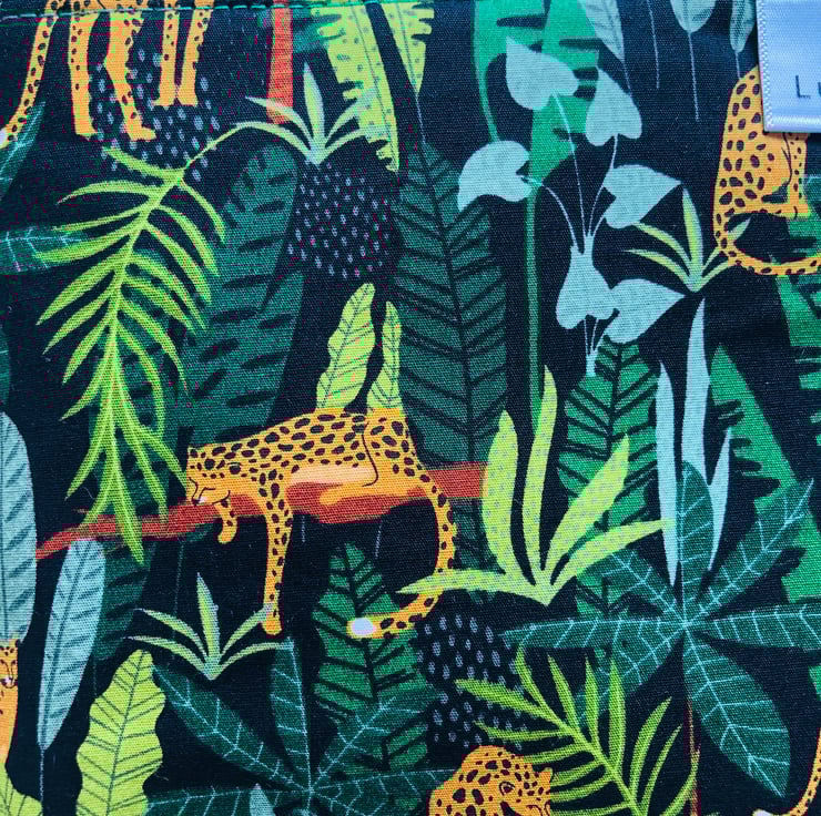 A gorgeous and useful pouch in a bold jungle print featuring lovely lazy leopards! I love fun prints like this.