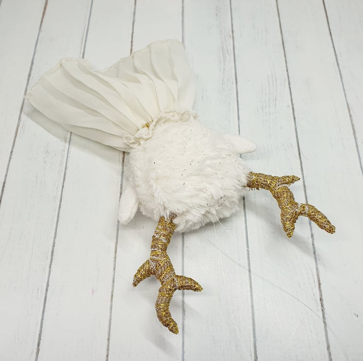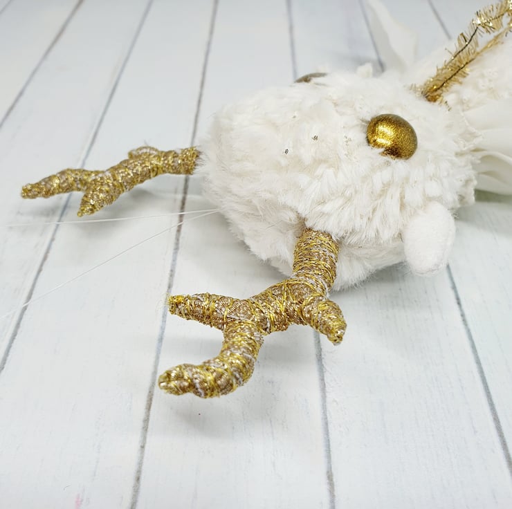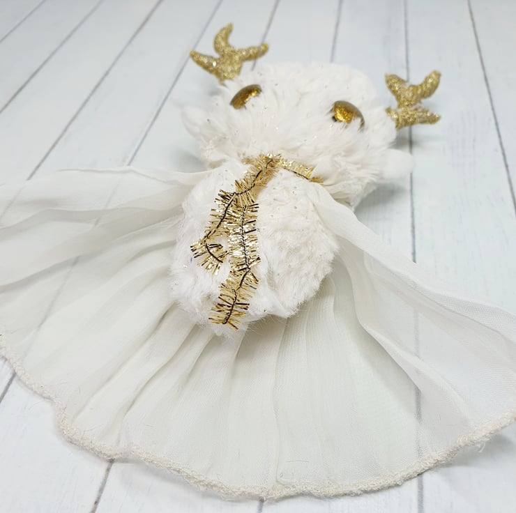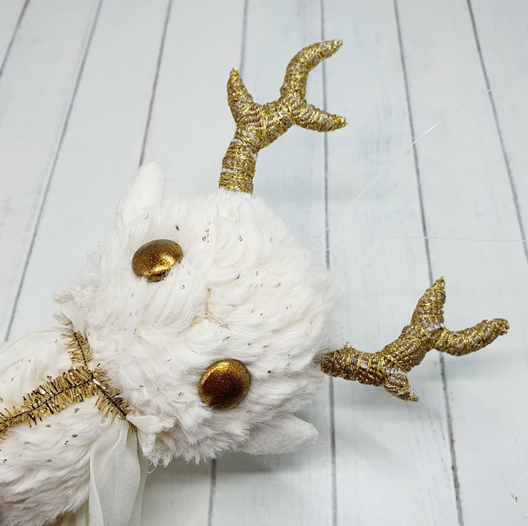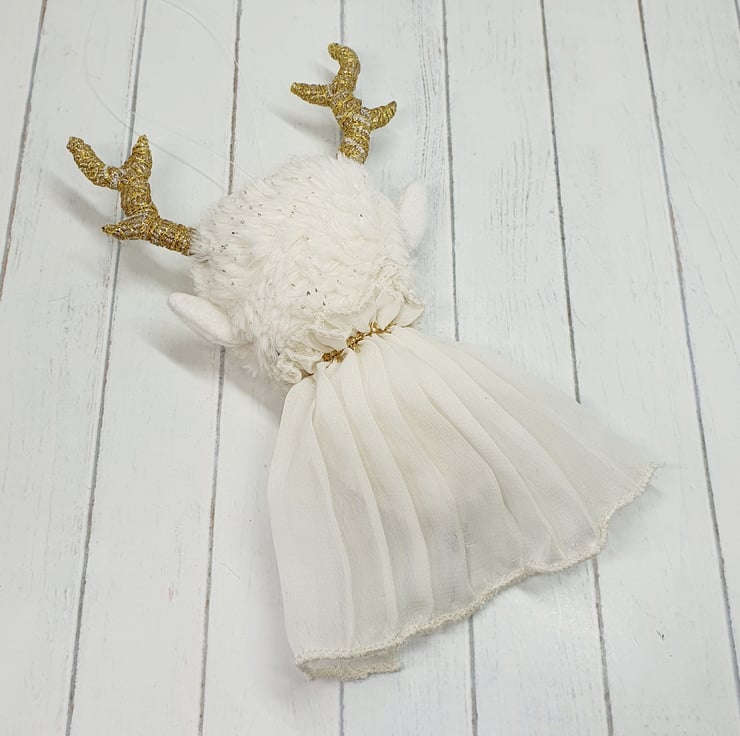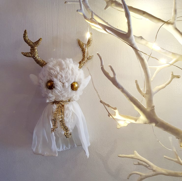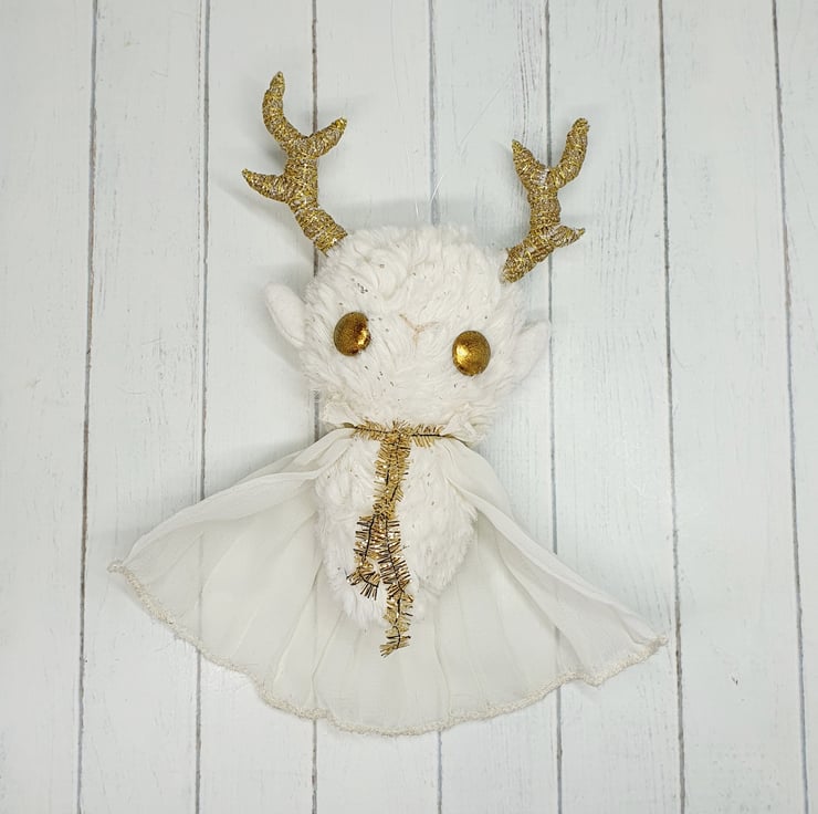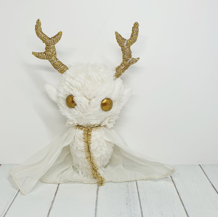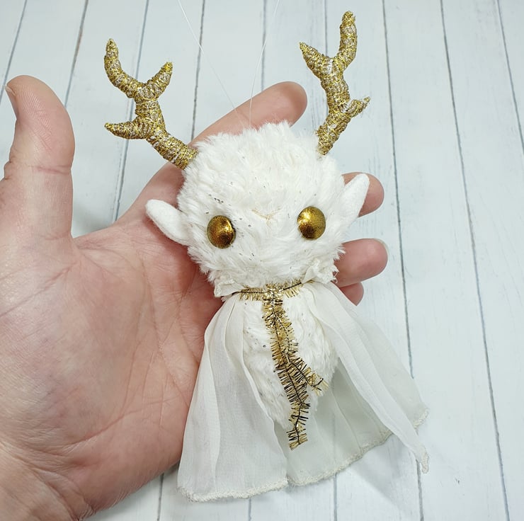This magical creature is made from soft faux fur with gold metallic flecks. They have golden eyes and hand stitched details with felt ears. This Wisp wears an upcycled lacey cape with tinsel trim. The antlers are made from twisted wire covered in gold ribbon and thread and are sewn into place. This one of a kind art doll measures roughly 15cm tall and comes with a transparent loop hanger. This is made for decorative purposes only and is not a toy.