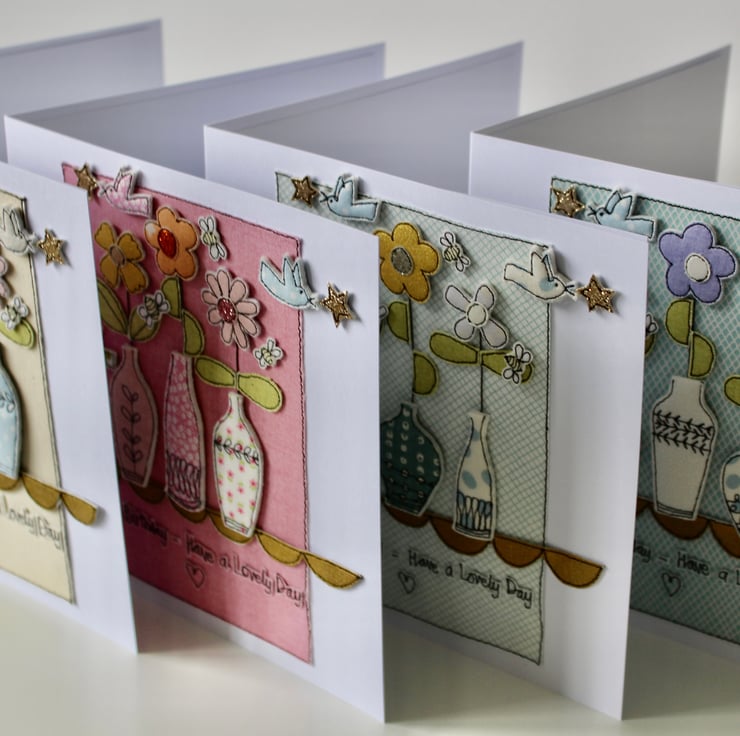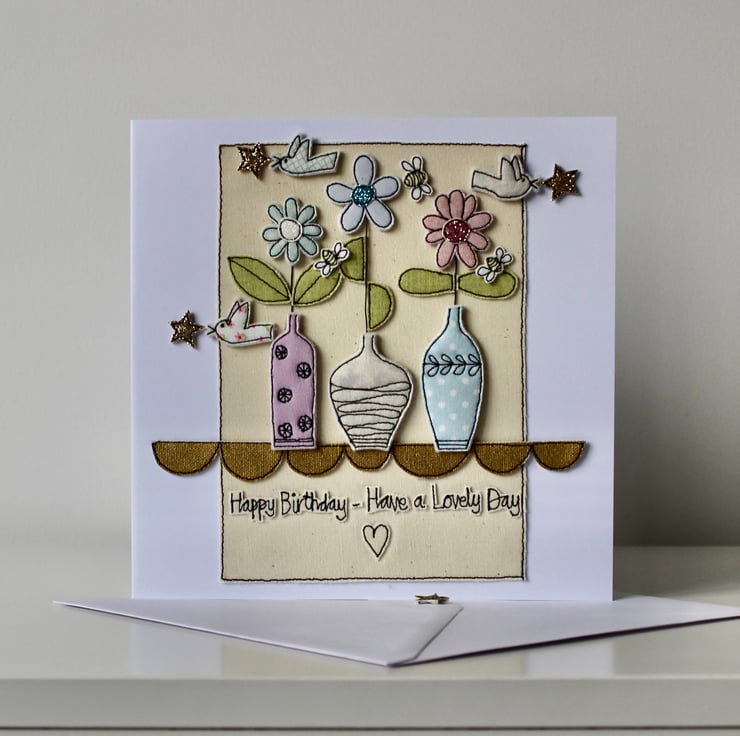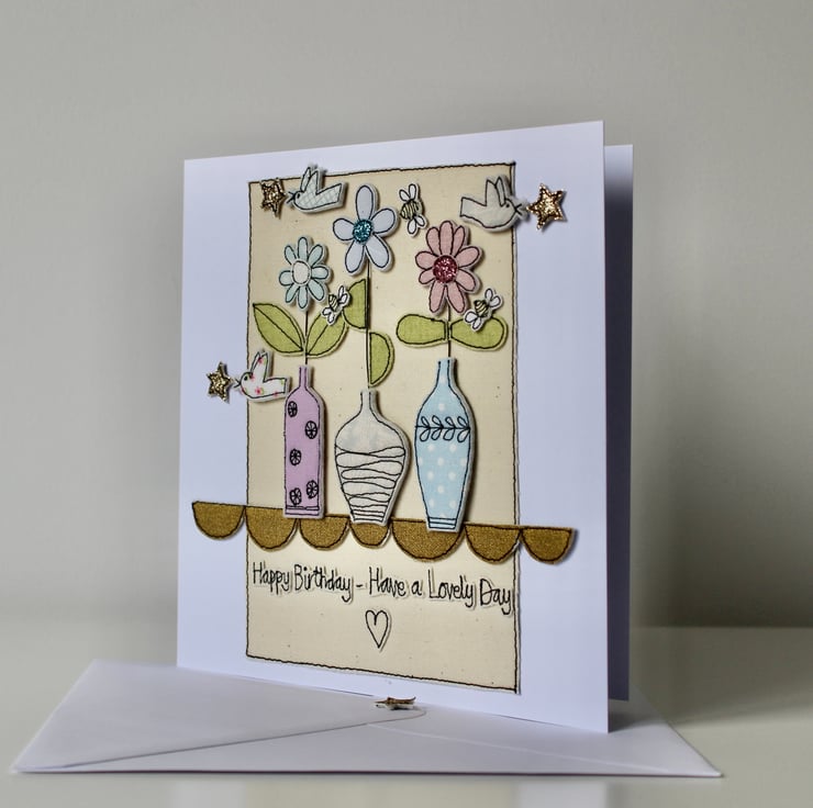 A handmade card which includes three vessels, three blooms, three birds, three bees and three stars. With the sewn words 'Happy Birthday - Have a Lovely Day'.